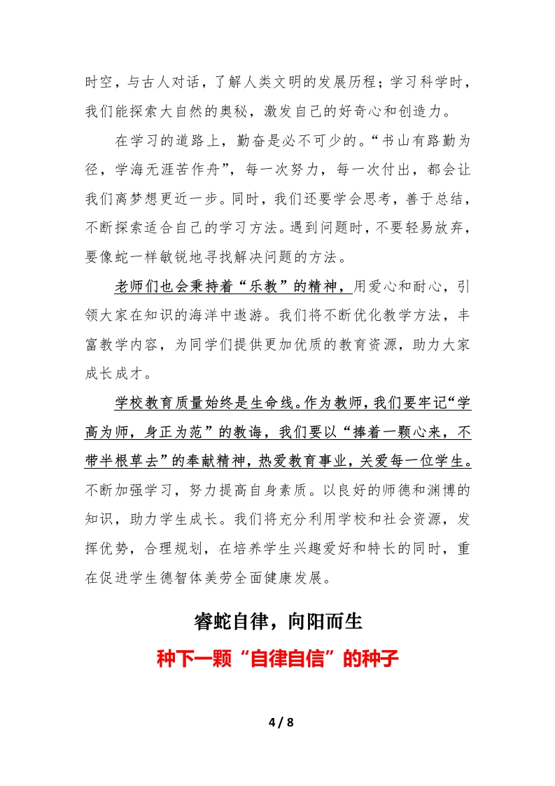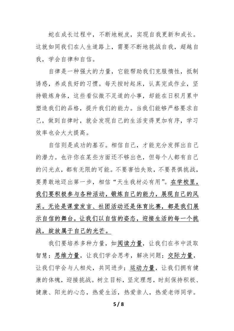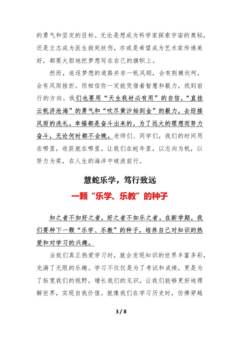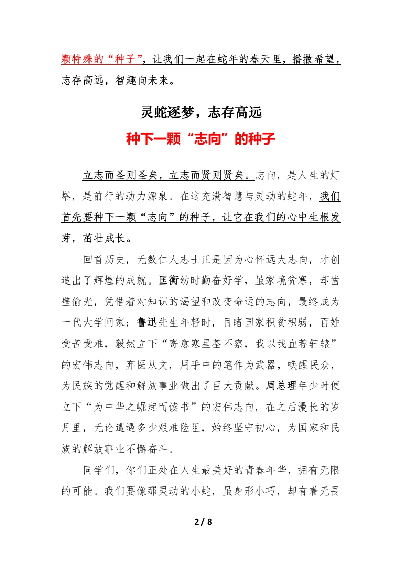 2025蛇年春季开学典礼校长致辞稿晨晨老师3个月前发布关注私信23.45KB8页04415 以下为资料部分截图预览,下载后为超高清原文件。 第1页 / 共8页 第2页 / 共8页 第3页 / 共8页 第4页 / 共8页 第5页 / 共8页 试读已结束,还剩3页,您可下载完整版后进行离线阅读 加入VIP,享海量教务资料,无限制免费下载所有材料 2025蛇年春季开学典礼校长致辞稿此内容为付费资源,请付费后查看¥9.99¥15.99VIP会员免费代理(享70%分佣)免费立即购买您当前未登录!建议登陆后购买,可保存购买订单付费资源© 版权声明文章版权归作者所有,未经允许请勿转载。THE END作业设计 喜欢就支持一下吧点赞15 分享QQ空间微博QQ好友海报分享复制链接收藏