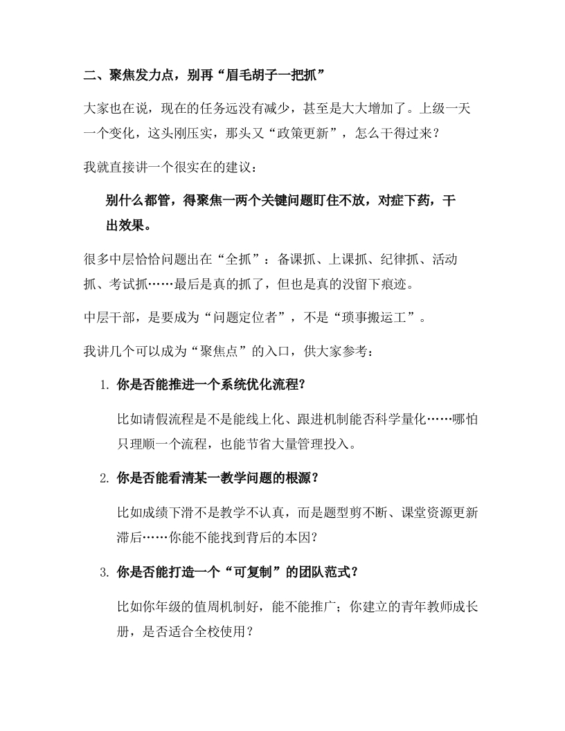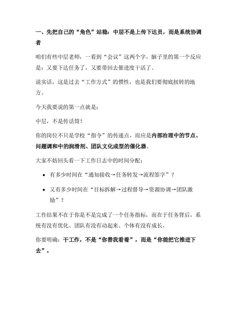 新学期第一次中层领导会议上,校长讲话:向内成长・向外发力・协同破局晨晨老师3个月前发布关注私信22.73KB7页03011 以下为资料部分截图预览,下载后为超高清原文件。 第1页 / 共7页 第2页 / 共7页 第3页 / 共7页 第4页 / 共7页 试读已结束,还剩3页,您可下载完整版后进行离线阅读 加入VIP,享海量教务资料,无限制免费下载所有材料 新学期第一次中层领导会议上,校长讲话:向内成长・向外发力・协同破局此内容为付费资源,请付费后查看¥9.99¥15.99VIP会员免费代理(享70%分佣)免费立即购买您当前未登录!建议登陆后购买,可保存购买订单付费资源© 版权声明文章版权归作者所有,未经允许请勿转载。THE END校长讲话 喜欢就支持一下吧点赞11 分享QQ空间微博QQ好友海报分享复制链接收藏