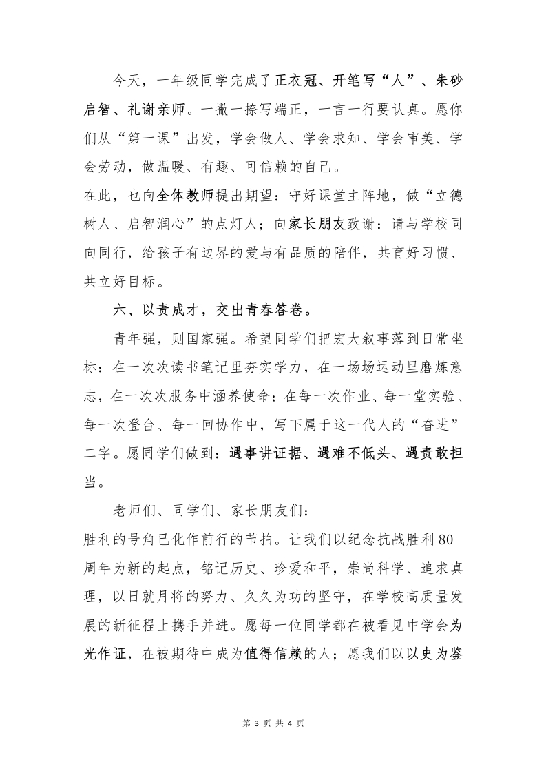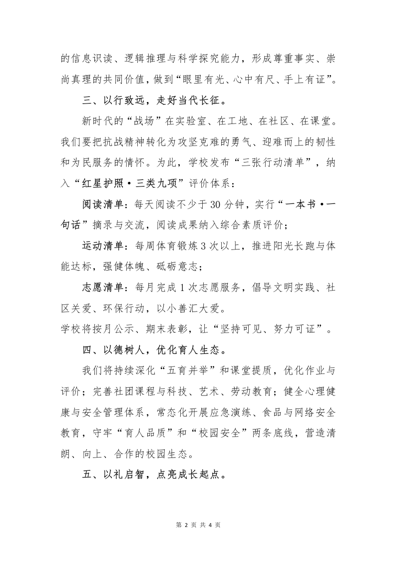 2025年秋季开学典礼纪念抗日战争胜利80周年校长讲话稿:以史为鉴守初心,以行致远启新程晨晨老师3个月前发布关注私信0.17MB4页02715 以下为资料部分截图预览,下载后为超高清原文件。 第1页 / 共4页 第2页 / 共4页 第3页 / 共4页 试读已结束,还剩1页,您可下载完整版后进行离线阅读 加入VIP,享海量教务资料,无限制免费下载所有材料 2025年秋季开学典礼纪念抗日战争胜利80周年校长讲话稿:以史为鉴守初心,以行致远启新程此内容为付费资源,请付费后查看¥9.99¥15.99VIP会员免费代理(享70%分佣)免费立即购买您当前未登录!建议登陆后购买,可保存购买订单付费资源© 版权声明文章版权归作者所有,未经允许请勿转载。THE END校长讲话 喜欢就支持一下吧点赞15 分享QQ空间微博QQ好友海报分享复制链接收藏