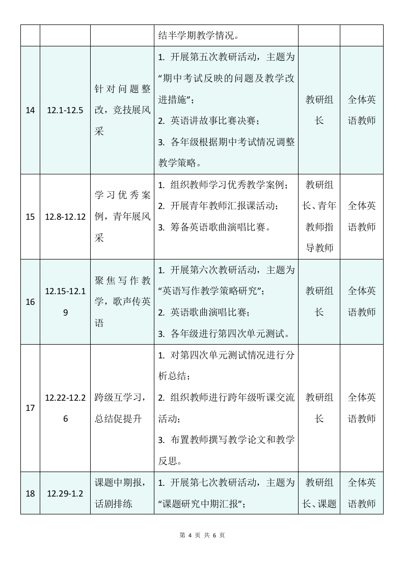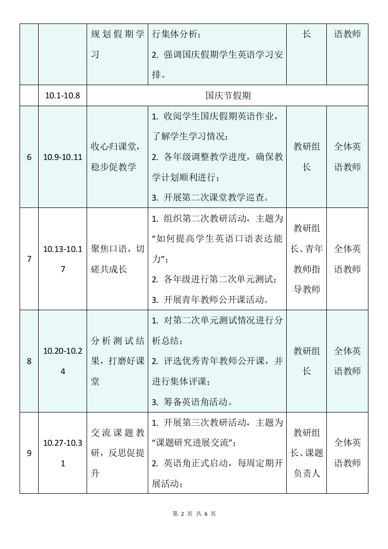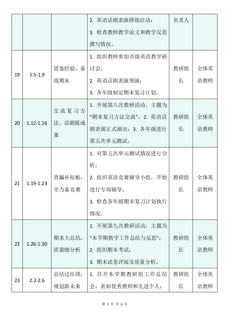 2025-2026学年第一学期英语教研组工作安排表:研思并进提素养,教启新程育英才晨晨老师3个月前发布关注私信0.27MB6页03612 以下为资料部分截图预览,下载后为超高清原文件。 第1页 / 共6页 第2页 / 共6页 第3页 / 共6页 第4页 / 共6页 第5页 / 共6页 试读已结束,还剩1页,您可下载完整版后进行离线阅读 加入VIP,享海量教务资料,无限制免费下载所有材料 2025-2026学年第一学期英语教研组工作安排表:研思并进提素养,教启新程育英才此内容为付费资源,请付费后查看¥9.99¥15.99VIP会员免费代理(享70%分佣)免费立即购买您当前未登录!建议登陆后购买,可保存购买订单付费资源© 版权声明文章版权归作者所有,未经允许请勿转载。THE END发言讲话 喜欢就支持一下吧点赞12 分享QQ空间微博QQ好友海报分享复制链接收藏
