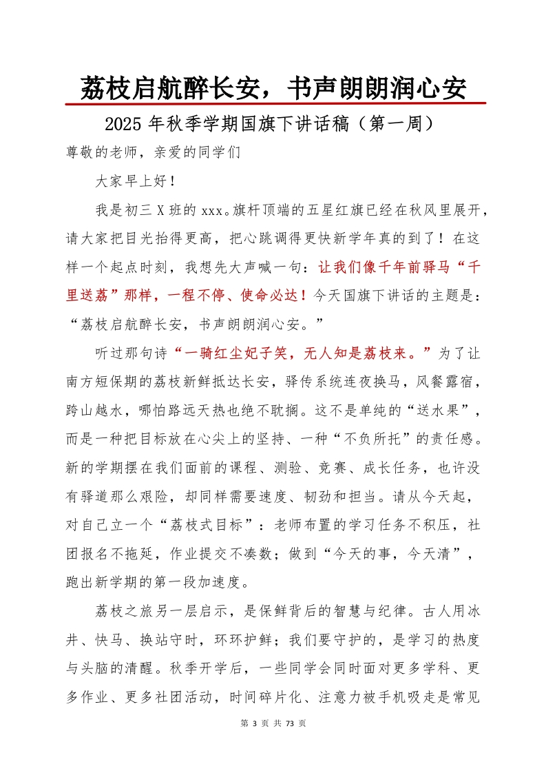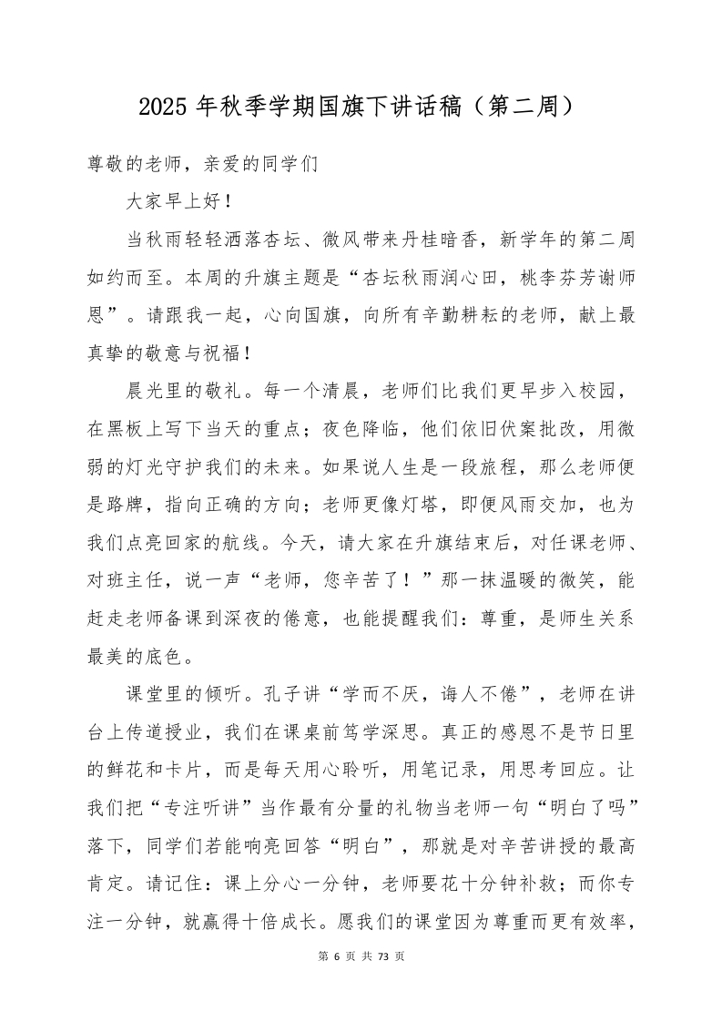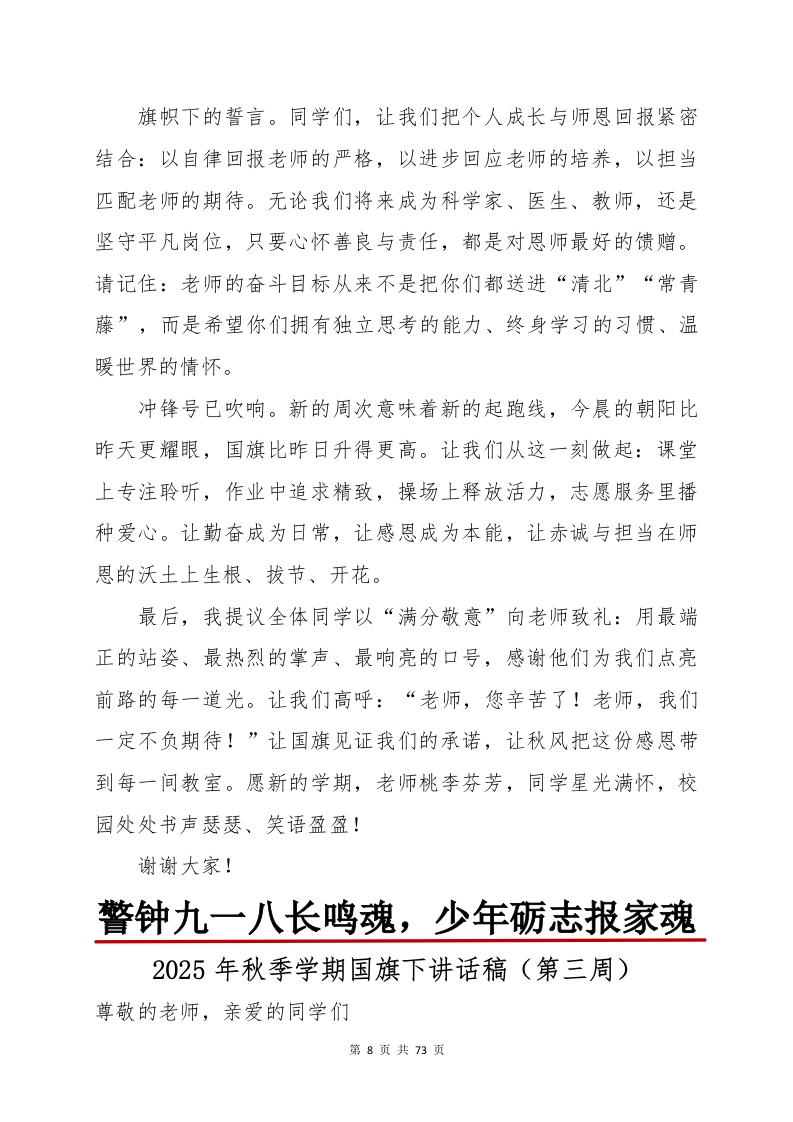 2025年秋季学期国旗下讲话稿(2)晨晨老师3个月前发布关注私信0.78MB73页0365 以下为资料部分截图预览,下载后为超高清原文件。 第1页 / 共73页 第2页 / 共73页 第3页 / 共73页 第4页 / 共73页 第5页 / 共73页 第6页 / 共73页 第7页 / 共73页 第8页 / 共73页 第9页 / 共73页 第10页 / 共73页 试读已结束,还剩63页,您可下载完整版后进行离线阅读 加入VIP,享海量教务资料,无限制免费下载所有材料 2025年秋季学期国旗下讲话稿(2)此内容为付费资源,请付费后查看¥9.99¥15.99VIP会员免费代理(享70%分佣)免费立即购买您当前未登录!建议登陆后购买,可保存购买订单付费资源© 版权声明文章版权归作者所有,未经允许请勿转载。THE END演讲致词 喜欢就支持一下吧点赞5 分享QQ空间微博QQ好友海报分享复制链接收藏