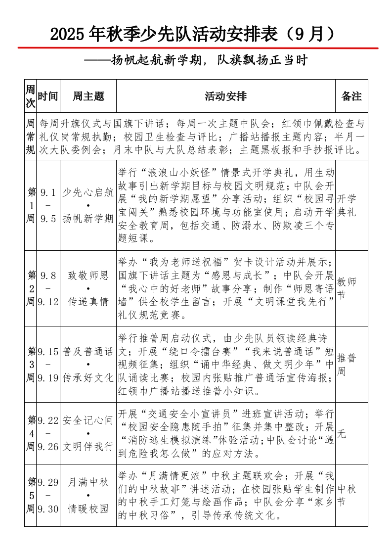 2025-2026秋季学年第一学期学校少先队活动主题安排表(及每月活动安排表)晨晨老师3个月前发布关注私信0.30MB7页03915 以下为资料部分截图预览,下载后为超高清原文件。 第1页 / 共7页 第2页 / 共7页 第3页 / 共7页 试读已结束,还剩4页,您可下载完整版后进行离线阅读 加入VIP,享海量教务资料,无限制免费下载所有材料 2025-2026秋季学年第一学期学校少先队活动主题安排表(及每月活动安排表)此内容为付费资源,请付费后查看¥9.99¥15.99VIP会员免费代理(享70%分佣)免费立即购买您当前未登录!建议登陆后购买,可保存购买订单付费资源© 版权声明文章版权归作者所有,未经允许请勿转载。THE END校长讲话 喜欢就支持一下吧点赞15 分享QQ空间微博QQ好友海报分享复制链接收藏