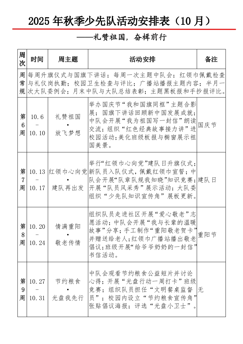 2025-2026学年第一学期学校少先队活动主题安排表(及每月活动安排表)月周日期周主题活动安排备注举行新学期开学典礼,融入“浪浪山小妖怪”故事情节,让师生在趣味与19.1-9.5启程扬帆·逐梦浪浪山仪式感中明白守正创新、互助进取的重要性;开展新学期行为规范教育,开学典引导队员整理个人物品、佩戴好红领巾、端正坐姿与文明用语。礼组织庆祝第41个教师节活动,开展“写一封信给老师”“我为老师献祝福9.8-9.12师恩如山·温暖同行红领巾手抄报制作;各中队在主题队会上讲述一位感动自己的老师故事,教师节培养感恩与尊师情怀。月开展全国第28届推普周活动,组织“普通话朗诵接力”“推普宣传画展”9.15-9.3推普筑梦·同声飞扬在校园广播中每天推送普通话诵读示范音频;利用中队会进行普通话知识推普周竞赛。9.22-9.以“国际和平日”为契机,组织观看和平主题纪录片并开展交流讨论,制国际和26铭记历史·珍爱和平“和平心愿卡”;进行校园和平鸽绘画活动。平日9.29-9.5迎中秋·话团圆开展中秋节主题活动,少先队员讲述家乡中秋习俗,制作手工灯笼;组织中秋节30中秋诗词朗诵会,弘扬中华传统文化。10.6-10举办国庆节升旗仪式特别版,开展“我与祖国同成长”红领巾演讲比赛:6盛世华诞·礼赞祖国国庆节10组织国庆节主题绘画与手工活动。10.13-1红旗飘扬·童心向党结合少先队建队纪念日,举行新队员入队仪式;回顾少先队发展历程,开少先队+0.17展红领巾故事分享会。建队日月10.20-1开展“光盘行动”宣传周,制作节粮倡议卡并发放到各班:利用中队会讲世界粮80.24粮行节约·勒俭传家述节俭小故事;进行校园节约达人评选。食日10.27-勃以立德·俭以养性举行主题手抄报比赛,展示学生勃俭节约的心得:组织旧物改造创意赛。世界勃0.31俭日111.3-11安全记心·防患未然开展消防应急疏散演练,组织消防安全知识问答赛;少先队员绘制消防主消防安7题安全海报;观看校园防火短片并撰写心得。全日+111.10-集体为家·团结向前举办班级拔河赛、接力赛等团队运动项目:组织“合作闯关”活动,各小1.14队完成体能与智力挑战任务;在中队会上分享合作小故事。月11.17-1文明相伴·礼润童心开展“文明行为我先行”校园随手拍活动:举行礼仪情景剧表演;发放校21.21园文明倡议书,倡导良好礼貌习惯。无111.24-1举办“感恩相册”制作活动:写感恩明信片送给家人、老师或同学:组织1.28感恩有你·温暖前行感恩节主题朗诵会和“感恩之星”评选。感恩节3112.1-12安全出行·幸福回家开展交通安全知识闯关赛;班级制作交通安全情景剧并在中队会中表演:交通安校园绘制交通安全文化墙。全日112.8-12铭记历史·自强不息国家公祭日观影活动(抗战题材纪录片);主题演讲“历史不能忘”;组国家公512织“和平鸽”绘画与书签制作。祭日12.15-1月守法知礼·自护自强邀请法制副校长进校授课:举行校园模拟法庭:少先队员制作法律知识卡62.19片并在校园分享。12.22开展“冬至习俗知多少”主题分享;少先队员体验包饺子、做汤圆等传统2.26逐梦冬至·相约饺子7活动:冬至112.291喜迎新年·共谱华章组织新年联欢晚会与才艺表演;制作新年心愿卡悬挂在“心愿树”上;举元旦82办新年贺卡设计大赛并展出。h举办“寒假安全我知道”主题班会;开展“我的新年目标”演讲分享;绘1.5-1.9逐梦未来·温暖同行制寒假生活计划表。无921.12-1.各中队制作“学期回忆录”视频或照片墙:举行“红领巾之星”颁奖仪式:回顾成长·砥砺前行无16组织学期成果展示会(书画、手工、科技作品)。