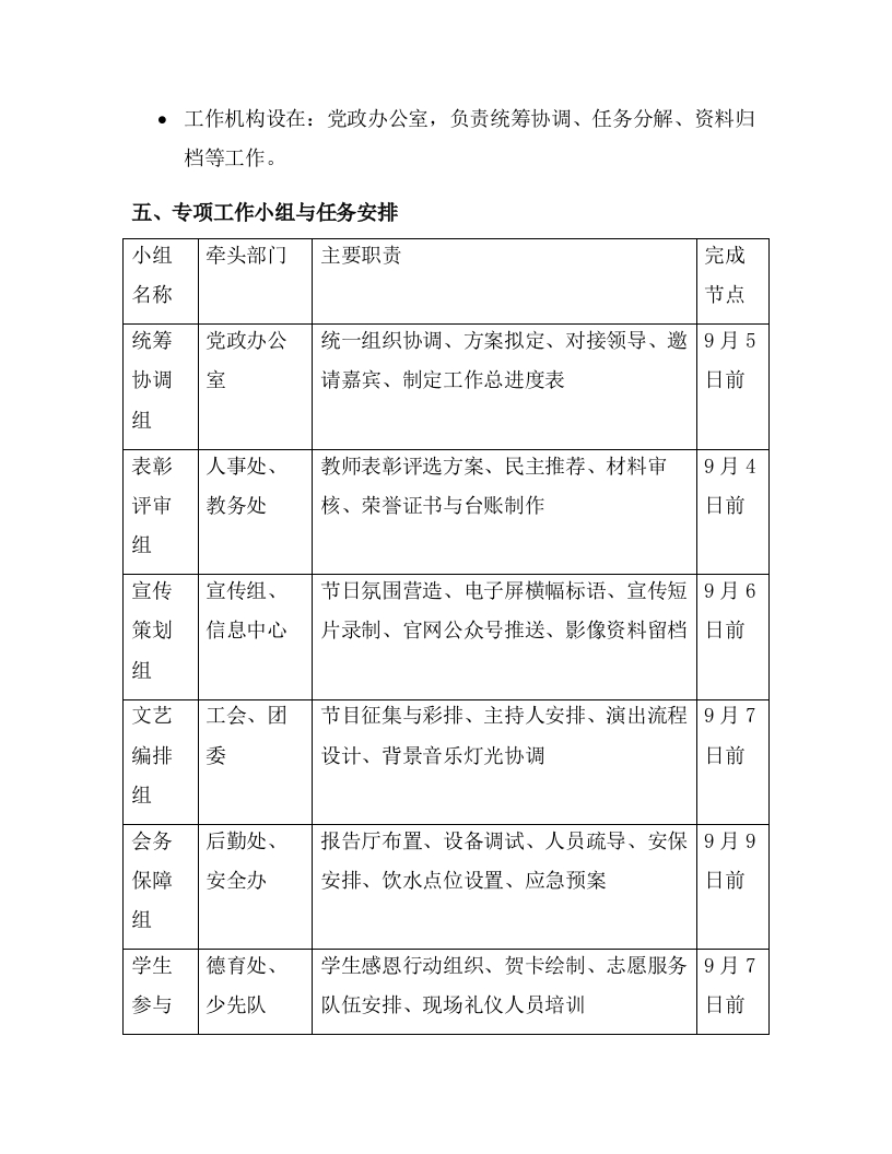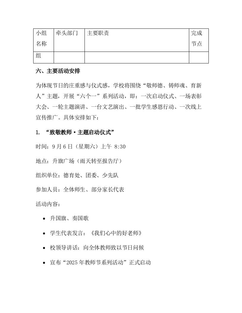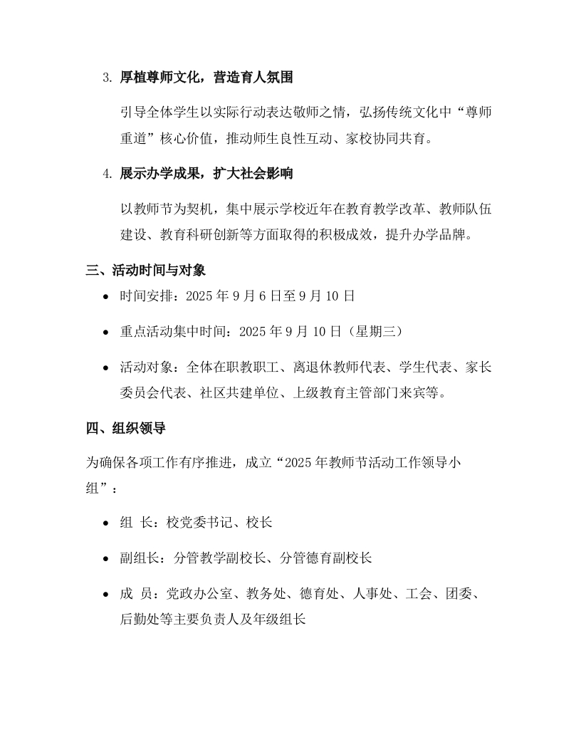 2025年学校教师节活动方案(新订)晨晨老师2个月前发布关注私信27.30KB11页0355 以下为资料部分截图预览,下载后为超高清原文件。 第1页 / 共11页 第2页 / 共11页 第3页 / 共11页 第4页 / 共11页 试读已结束,还剩7页,您可下载完整版后进行离线阅读 加入VIP,享海量教务资料,无限制免费下载所有材料 2025年学校教师节活动方案(新订)此内容为付费资源,请付费后查看¥9.99¥15.99VIP会员免费代理(享70%分佣)免费立即购买您当前未登录!建议登陆后购买,可保存购买订单付费资源© 版权声明文章版权归作者所有,未经允许请勿转载。THE END重要节日 文本预览 2025年学校教师节活动方案(新订)一、活动主题“敬师德·铸师魂·育新人”一x学校庆祝第41个教师节系列活动以“立德树人”为根本导向,营造尊师重教的良好氛围,展现新时代教师队伍良好风貌,增强教师职业荣誉感与归属感,进一步凝聚学校育人合力,推动师德建设与专业发展双提升。二、活动目的1.强化师德引领,弘扬育人精神引导广大教职员工深入思考“教书育人为谁、怎样教好书、怎样育好人”的根本问题,增强教师职业责任感、历史使命感。2.提升教师荣誉感,增强职业归属通过形式多样、内容丰富的节日庆祝活动,体现学校对广大教师的真情关爱和崇高敬意,增强队伍凝聚力和向心力。 查看更多 收起部分 喜欢就支持一下吧点赞5 分享QQ空间微博QQ好友海报分享复制链接收藏