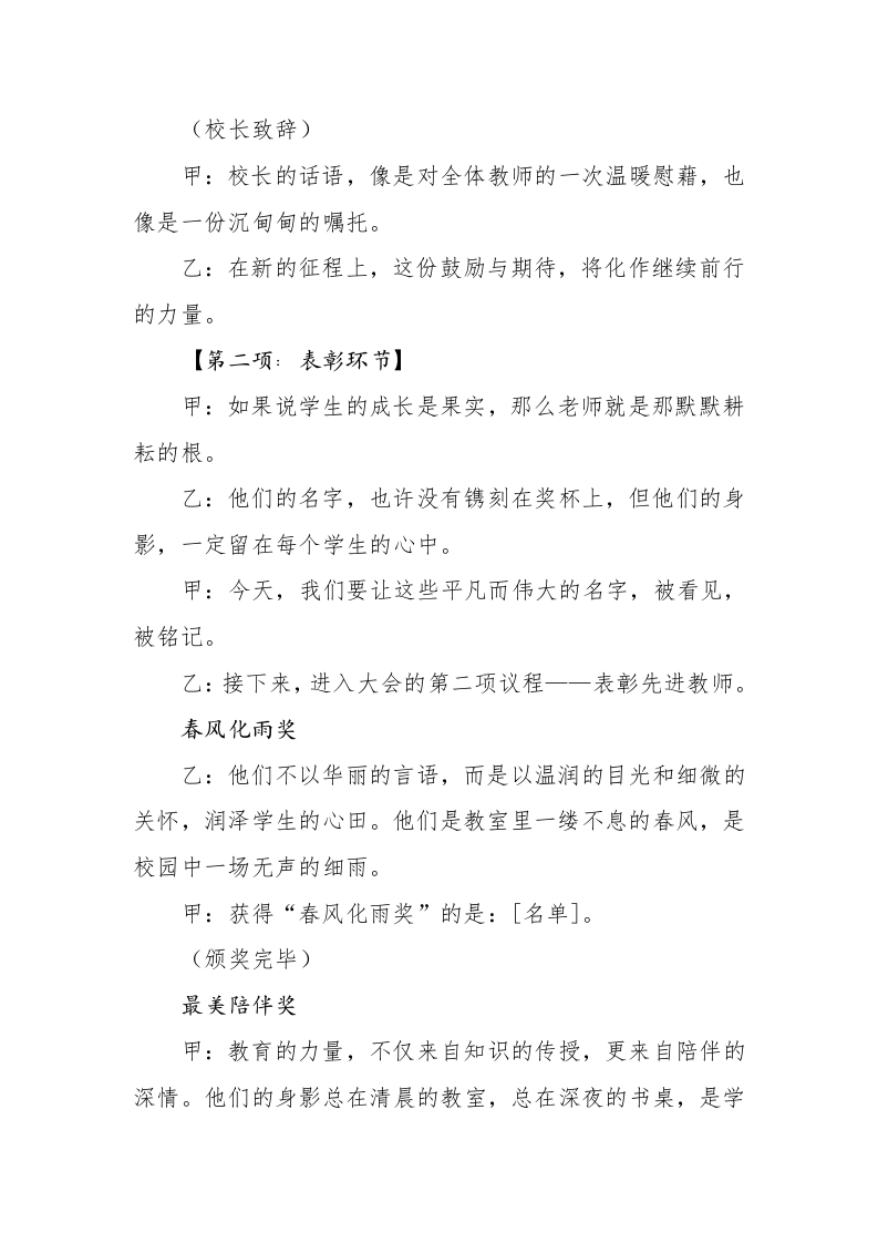 2025年学校庆祝第41个教师节表彰大会主持词一以教育家精神铸魂强师谱写教育强国建设华章甲:丹桂吐芳,书声琅琅。九月的校园,是丰收的田野,也是感恩的季节。乙:在这样的时刻,我们迎来了第41个教师节。甲:有人说,老师是点亮心灯的引路人:乙:有人说,老师是春风化雨的守望者。甲:可在我们心里,老师更是陪伴我们成长的那双眼神,是在犯错时一句温柔的提醒,是在低谷时一个坚定的肯定。乙:今天,我们汇聚一堂,把敬意写进笑容,把感恩化作掌声。因为,所有的赞美与颂歌,都应当献给老师。甲:本次大会的主题是“以教育家精神铸魂强师,谱写教育强国建设华章”。乙:在这里,我们向全体教师致以最崇高的敬意与最真挚的祝福。合:2025年庆祝第41个教师节表彰大会,现在开始【第一项:校长致锌】乙:教育是一种接力,每一棒都凝聚心血;教师是一种坚守,每一天都饱含深情。甲:在学校的发展中,校长既是掌舵者,也是守望者。乙:下面,让我们以热烈的掌声,欢迎校长发表致辞。