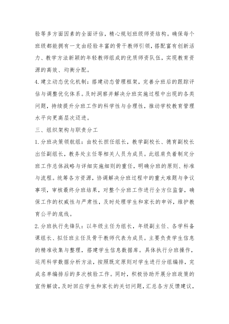 2025年高一年级分班工作方案晨晨老师2个月前发布关注私信15.25KB6页05012 以下为资料部分截图预览,下载后为超高清原文件。 第1页 / 共6页 第2页 / 共6页 试读已结束,还剩4页,您可下载完整版后进行离线阅读 加入VIP,享海量教务资料,无限制免费下载所有材料 2025年高一年级分班工作方案此内容为付费资源,请付费后查看¥9.99¥15.99VIP会员免费代理(享70%分佣)免费立即购买您当前未登录!建议登陆后购买,可保存购买订单付费资源© 版权声明文章版权归作者所有,未经允许请勿转载。THE END校长讲话 文本预览 在教育的宏大版图中,公平是基石,质量是追求。均衡分班,作为实现教育公平与提升教育质量的关键环节,承载着无数学生的未来与希望。以下,是一份全新架构下的均衡分班工作方案,旨在为学生营造更为公平、优质的教育环境。一、核心理念与原则遵循以学生的全面发展为核心指引,深度契合教育与成长规律,将立德树人作为根本使命。在分班过程中,严格坚守公平、科学、系统的原则,全面考量学生的学业基础、学习能力、潜能特质等多元因素,构建科学合理的分班体系,实现教育资源的均衡调配,确保每一位学生都能在公平公正的环境中,享受高质量教育,迈向德智体美劳全面发展的成长之路,为培育社会主义建设者和接班人筑牢根基。二、工作目标全景勾勒1.构建公正透明分班体系:打造一套科学完善的班级划分体系,确保分班全程公开透明、操作规范有序、结果公平公正。充分保障学生和家长的知情权、参与权与监督权,以此提升教育管理工作在公众心中的公信力,赢得广泛的社会认同与赞誉。2.消除班级差异鸿沟:通过实施性别比例、学业成绩、综合素养等多维度的均衡策略,有效缩小班级间的显著差异,为各类教育活动的顺利开展铺就坚实道路,使每个班级都能在相对平等的起点上,激发教育活力,促进学生共同进步。3.优化师资均衡配置:基于对教师专业素养、教学能力、实践经 查看更多 收起部分 喜欢就支持一下吧点赞12 分享QQ空间微博QQ好友海报分享复制链接收藏