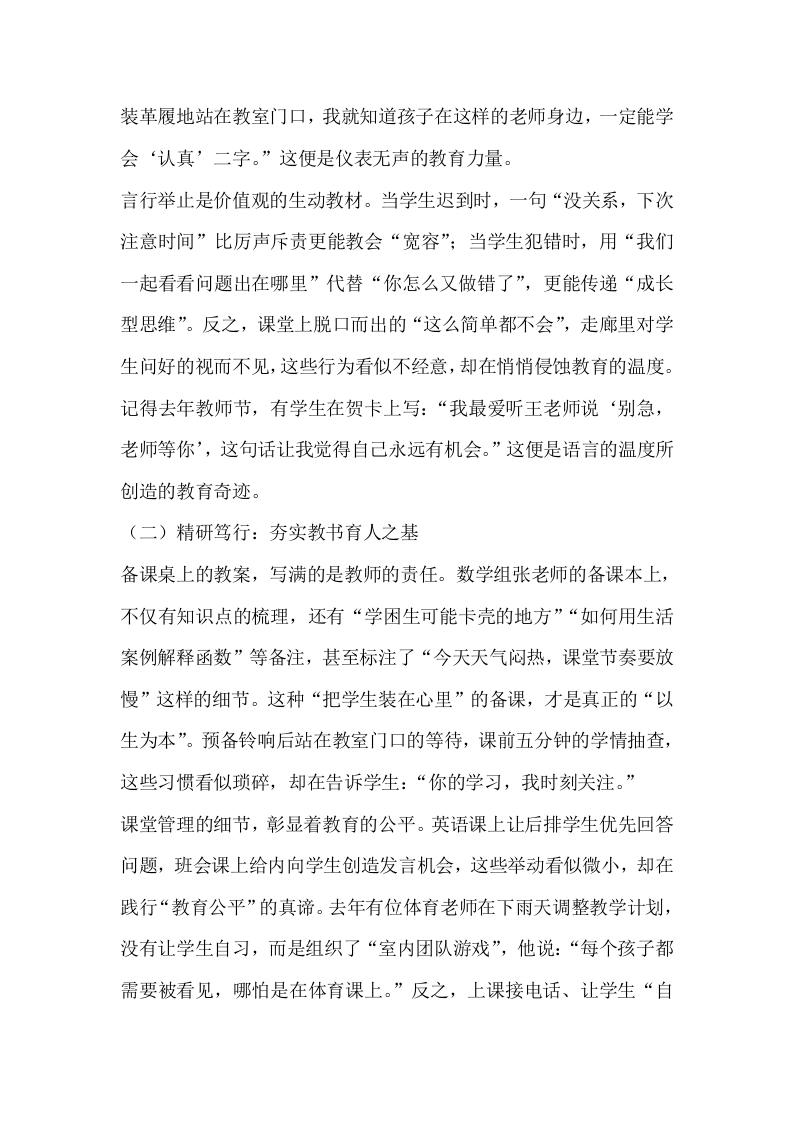 2025秋季开学第一次教师会暨师德师风会,校长发言:铸师魂以立本,育桃李而润心晨晨老师2个月前发布关注私信16.83KB7页04110 以下为资料部分截图预览,下载后为超高清原文件。 第1页 / 共7页 第2页 / 共7页 试读已结束,还剩5页,您可下载完整版后进行离线阅读 加入VIP,享海量教务资料,无限制免费下载所有材料 2025秋季开学第一次教师会暨师德师风会,校长发言:铸师魂以立本,育桃李而润心此内容为付费资源,请付费后查看¥9.99¥15.99VIP会员免费代理(享70%分佣)免费立即购买您当前未登录!建议登陆后购买,可保存购买订单付费资源© 版权声明文章版权归作者所有,未经允许请勿转载。THE END校长讲话 文本预览 2025秋季开学第一次教师会暨师德师风会,校长发言:铸师魂以立本,育桃李而润心各位老师:上午好!金秋送爽,丹桂飘香,我们又一次站在新学期的起点上。看着熟悉的校园里跃动的青春身影,感受着空气中弥漫的求知气息,我由衷地为身为教育者而自豪。今天,我们齐聚一堂,不仅要明确新学期的工作方向,更要共同重温一个核心命题一一“你的样子,就是教育的样子”。而支撑这个命题的根基,正是我们常谈常新的师德师风。陶行知先生“学高为师,身正为范”的教诲,穿越百年依然振聋发聩。师德是教育的灵魂,师风是育人的底色。当我们讨论教师行为规范时,本质上是在探寻如何让师德师风从抽象的理念,转化为举手投足间的自觉行动。今天,我想以“铸魂、赋能、润心”三个关键词,与大家共同勾勒新时代教师的精神坐标。一、铸魂:坚守育人初心的根本(一)正身立范:涵养职业敬畏之心教师的仪表风范是职业精神的外在投射。女教师淡雅的妆容、合体的服饰,传递的是对职业的敬畏;男教师整洁的发型、端庄的着装,展现的是对教育的庄重。在酷暑时节保持衣衫整洁,在寒冬腊月避免臃肿随意,这些细节看似微小,却在潜移默化中告诉学生:何为“专业”,何为“自律”。去年有位家长在反馈中写道:“每次看到李老师总是西 查看更多 收起部分 喜欢就支持一下吧点赞10 分享QQ空间微博QQ好友海报分享复制链接收藏