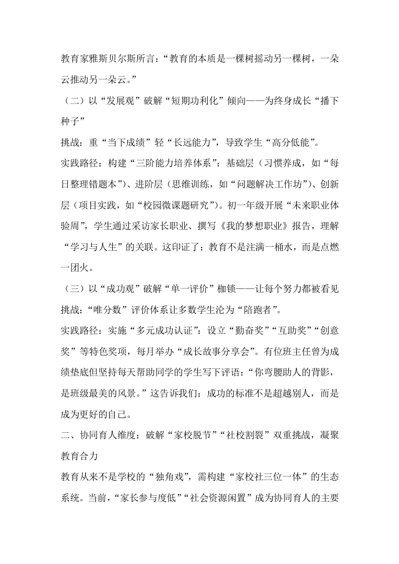 全校班主任工作会议,校长讲话:破解“七重挑战”,构建班级育人“三维模型”晨晨老师2个月前发布关注私信14.87KB5页04010 以下为资料部分截图预览,下载后为超高清原文件。 第1页 / 共5页 第2页 / 共5页 试读已结束,还剩3页,您可下载完整版后进行离线阅读 加入VIP,享海量教务资料,无限制免费下载所有材料 全校班主任工作会议,校长讲话:破解“七重挑战”,构建班级育人“三维模型”此内容为付费资源,请付费后查看¥9.99¥15.99VIP会员免费代理(享70%分佣)免费立即购买您当前未登录!建议登陆后购买,可保存购买订单付费资源© 版权声明文章版权归作者所有,未经允许请勿转载。THE END校长讲话 文本预览 全校班主任工作会议,校长讲话:破解“七重挑战”,构建班级育人“三维模型”各位班主任同仁:教育是唤醒灵魂的艺术,班主任则是这场艺术最执着的践行者。当前,我们正面临“价值引领弱化”“家校协同松散”“管理方法固化”等七重现实挑战。今天,我将围绕“价值引领一协同育人一创新发展”三维模型,与大家探讨破解之道,共同书写新时代班主任工作的“突围与超越”。一、价值引领维度:破解“理念滞后”“评价单一”双重挑战,筑牢育人根基教育的终极命题是“培养什么人、怎样培养人”。面对“唯分数论”的惯性思维与“成长目标模糊”的现实困境,我们需以“三观重塑”破局,让教育回归“育人本质”。(一)以“生命观”破解“同质化培养”困境一一让每个孩子成为“独特的风景”挑战:部分班主任仍存在“用统一标准衡量学生”的倾向,导致“千人一面”。实践路径:推行“成长光谱评价法”,从“品德修养、学业发展、兴趣特长、社会实践”四个维度建立个性化档案。例如,高二年级(3)班将学生比作“花园植物”:为“含羞草型”内向学生设计“小组发言人轮换制”,为“向日葵型”活跃学生搭建“活动策划平台”。正如 查看更多 收起部分 喜欢就支持一下吧点赞10 分享QQ空间微博QQ好友海报分享复制链接收藏