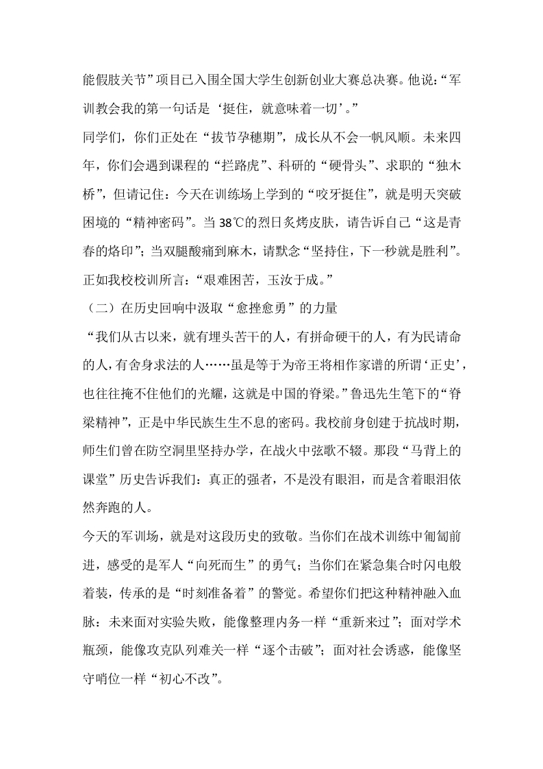 校长在2025级新生军训开幕式讲话:三个关键词,锻造青春的硬核力量各位教官、老师们,亲爱的2025级新同学们:大家上午好!秋阳杲杲,丹桂飘香。今天,我们以迷彩为甲,以操场为卷,共同开启2025级新生的军训征程。首先,我谨代表学校全体师生,向跨越山海而来的新同学致以最热烈的欢迎!向承训部队的教官们致以最诚挚的敬意!向为军训保驾护航的全体教职工道一声:辛苦了!同学们,当你们接过这身迷彩军装,就接过了一份特殊的“成人礼”。军训是大学的第一课,更是人生的“磨刀石”一一它磨去的是娇气与浮躁,磨出的是筋骨与锋芒;它褪去的是稚气与迷茫,镀上的是担当与荣光。今天,我想通过三个关键词,与大家共同探讨:如何在14天的军训中,锻造青春的“硬核力量”,为人生写下浓墨重彩的开篇。一、第一个关键词:坚韧一一以钢铁意志跨越成长的“娄山关”(一)在极限挑战中淬炼“咬牙挺住”的勇气“志不立,天下无可成之事。”军训的每一个科目,都是对意志的“极限测试”。站军姿时,汗水从额角滑落至眼角而不眨一下,是对“专注”的考验;踢正步时,脚踝磨出血泡仍步步铿锵,是对“坚持”的诠释;野外拉练时,负重行军二十公里而不掉队,是对“耐力”的锤炼。我校机械工程学院2022级学生赵X,在去年军训中因低血糖晕倒,醒来后拒绝退出,咬牙完成了后续所有训练。如今,他研发的“智