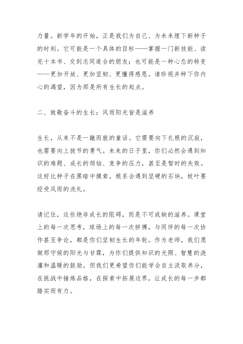 在2025年秋季开学典礼上的讲话:以种子之名,向生长致敬,赴收获之约晨晨老师2个月前发布关注私信13.20KB4页04314 以下为资料部分截图预览,下载后为超高清原文件。 第1页 / 共4页 第2页 / 共4页 试读已结束,还剩2页,您可下载完整版后进行离线阅读 加入VIP,享海量教务资料,无限制免费下载所有材料 在2025年秋季开学典礼上的讲话:以种子之名,向生长致敬,赴收获之约此内容为付费资源,请付费后查看¥9.99¥15.99VIP会员免费代理(享70%分佣)免费立即购买您当前未登录!建议登陆后购买,可保存购买订单付费资源© 版权声明文章版权归作者所有,未经允许请勿转载。THE END校长讲话 文本预览 在2025年秋季开学典礼上的讲话:以种子之名,向生长致敬,赴收获之约尊敬的各位领导、老师,亲爱的同学们:大家好!金风送爽,丹桂飘香。今天,我们怀着喜悦与憧憬,齐聚在这片孕育梦想的园地,共同开启新学年的征程。很荣幸能作为教师代表,与大家分享一些关于“种子、生长与收获”的思考。一、埋下希望的种子:每一颗都蕴藏着无限可能同学们,你们正如一颗颗独特的种子,被时光与缘分轻轻播撒在这片校园的沃土之中。或许你是一颗渴望探索星空的科学种子,一颗钟情于文字与表达的人文种子,一颗善于创造与发现的艺术种子,亦或是一颗尚未完全明确自我,但充满好奇与热忱的种子。请相信,每一颗种子都自带生命的蓝图,都拥有破土而出的 查看更多 收起部分 喜欢就支持一下吧点赞14 分享QQ空间微博QQ好友海报分享复制链接收藏
