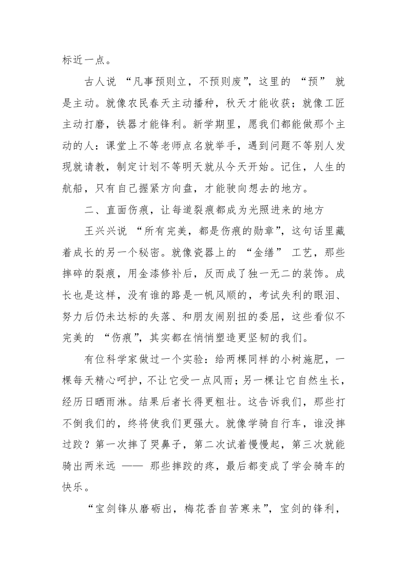 校长2025年秋季开学典礼、思政第一课讲话稿:以奋斗为帆,破万难远航晨晨老师2个月前发布关注私信17.74KB13.65KB4页0489 以下为资料部分截图预览,下载后为超高清原文件。 第1页 / 共4页 第2页 / 共4页 试读已结束,还剩2页,您可下载完整版后进行离线阅读 加入VIP,享海量教务资料,无限制免费下载所有材料 校长2025年秋季开学典礼、思政第一课讲话稿:以奋斗为帆,破万难远航此内容为付费资源,请付费后查看¥9.99¥15.99VIP会员免费代理(享70%分佣)免费立即购买您当前未登录!建议登陆后购买,可保存购买订单付费资源© 版权声明文章版权归作者所有,未经允许请勿转载。THE END校长讲话 文本预览 校长2025年秋季开学典礼、思政第一课讲话稿:以奋斗为帆,破万难远航亲爱的同学们、老师们:站在新学期的晨光里,看着你们眼中闪烁的期待,我想起了两句话。路遥说:“生活不能等别人来安排,要自己去争取和奋斗。”王兴兴说:“所有完美,都是伤痕的勋章。”这两句话像两把钥匙,一把打开主动前行的门,一把解开直面困境的心。今天这堂思政课,我们就从这两句话说起。一、主动奋斗,让人生的方向盘握在自己手里生活中总有这样的时刻:有人等老师布置完所有任务才开始动笔,有人等同学主动打招呼才敢开口,有人等机会上门才愿意伸手。但路遥说“不能等别人来安排”,因为真正的成长,从来都是自己主动迈出第一步。就像春天的种子,不会等别人叫醒才发芽,而是自己攒足了力气,顶开泥土去拥抱阳光。在我们身边,就有很多主动奋斗的例子。有同学发现自己作文总写不好,没有等老师催,主动每天读一篇范文,摘抄三个好词好句,一学期下来,作文本上的红圈越来越多:有同学体育测试总不及格,没有等别人督促,每天放学后多跑一圈操场,坚持了三个月,不仅及格了,还爱上了跑步。这些看似微小的主动,其实都是在为自己的人生掌舵一一你主动多学一点,就离知识近一点;主动多练一次,就离目 查看更多 收起部分 喜欢就支持一下吧点赞9 分享QQ空间微博QQ好友海报分享复制链接收藏