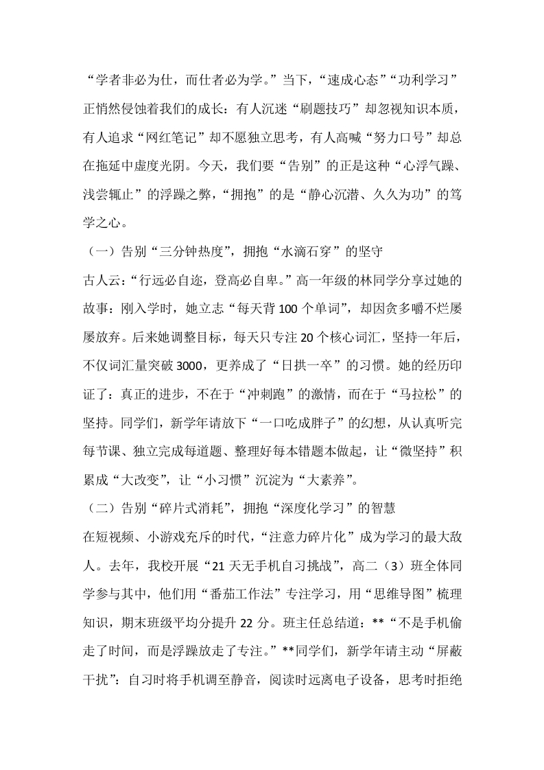 2025年秋季开学典礼,校长讲话:告别昨日之我,拥抱明日之新晨晨老师2个月前发布关注私信16.70KB7页02614 以下为资料部分截图预览,下载后为超高清原文件。 第1页 / 共7页 第2页 / 共7页 试读已结束,还剩5页,您可下载完整版后进行离线阅读 加入VIP,享海量教务资料,无限制免费下载所有材料 2025年秋季开学典礼,校长讲话:告别昨日之我,拥抱明日之新此内容为付费资源,请付费后查看¥9.99¥15.99VIP会员免费代理(享70%分佣)免费立即购买您当前未登录!建议登陆后购买,可保存购买订单付费资源© 版权声明文章版权归作者所有,未经允许请勿转载。THE END校长讲话 文本预览 2025年秋季开学典礼,校长讲话:告别昨日之我,拥抱明日之新尊敬的各位老师,亲爱的同学们:大家上午好!当秋叶染黄枝头,当晨光洒满操场,我们又一次站在时光的交汇点一一身后是满载收获的过往,眼前是充满未知的前方。此刻,我想问大家一个问题:如果用一个词形容“昨日的自己”,你会选择什么?而“明日的自己”,又该以怎样的姿态奔赴?今天,我们齐聚于此,正是为了告别那个“不够完美却真实存在”的昨日之我,拥抱那个“敢于突破、向光生长”的明日之新。首先,我代表学校,向全体师生致以新学期的问候,向新加入的师生们道一声:欢迎回家!回望过去一学年,我们共同书写了“在守正中创新,在传承中突破”的答卷:教师团队在国家级教学比赛中摘得金奖,学生科创作品入选“全国青少年科技创新大赛”,学校获评“国家级绿色学校”。这些成绩的背后,是“不恋过往,不畏将来”的勇气,是“革故鼎新,日新又新”的智慧。今天,我将围绕“告别浮躁之弊,拥抱笃学之心;告别守成之念,拥抱创新之勇:告别小我之境,拥抱大我之怀”三个维度,与大家共勉,愿我们以“破茧成蝶”的蜕变,在新学年遇见更好的自己!一、告别浮躁之弊,拥抱笃学之心一一以静心沉潜铸根基,以恒学不辍致远方 查看更多 收起部分 喜欢就支持一下吧点赞14 分享QQ空间微博QQ好友海报分享复制链接收藏