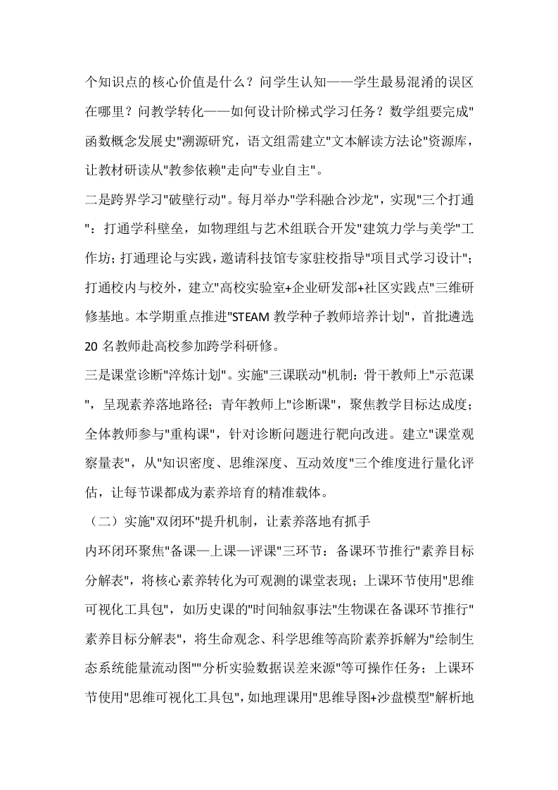 2025年秋季开学教师大会,教学副校长讲话:三维突破——破局·重构·跃升晨晨老师2个月前发布关注私信17.18KB7页0218 以下为资料部分截图预览,下载后为超高清原文件。 第1页 / 共7页 第2页 / 共7页 试读已结束,还剩5页,您可下载完整版后进行离线阅读 加入VIP,享海量教务资料,无限制免费下载所有材料 2025年秋季开学教师大会,教学副校长讲话:三维突破——破局·重构·跃升此内容为付费资源,请付费后查看¥9.99¥15.99VIP会员免费代理(享70%分佣)免费立即购买您当前未登录!建议登陆后购买,可保存购买订单付费资源© 版权声明文章版权归作者所有,未经允许请勿转载。THE END校长讲话 文本预览 2025年秋季开学教师大会,教学副校长讲话:三维突破一一破局·重构·跃升各位同仁:上午好!秋阳正好,丹桂芬芳。站在新学期的起跑线上,我们面临着"双减"深化、新课标落地、数字化转型的三重时代命题。今天,我想以"三维突破"为关键词,与大家共同探讨教学质量提升的破局之道、重构之策、跃升之路。当教育改革进入深水区,我们既要守住"为党育人"的初心之本,更要找到"为国育才"的创新之策,让成绩提升成为素养培育的自然结果,让教学质量成为学校发展的硬核底气。一、破局:以学科素养为基,破解"知识本位"困局苏霍姆林斯基曾警示我们:"如果教师的智力生活仅限于教材,则会导致教育的枯萎。"当前教学中存在的"三重三轻"现象亟待破解:重知识灌输轻思维培养,请记住,当我们只教知识时,学生得到的是暂时的分数:重分数结果轻成长过程,当我们只看结果时,可能错过了学生真正的成长;重统一教学轻个性指导,当我们用一个标准要求所有学生时,其实是在扼杀教育的多样性。破解这些困局,必须从教师学科素养的深度重构开始。(一)构建"三维研修"体系,让专业成长有路径一是教材研读"解码工程"。各学科组要建立"教材-课标考纲"三维对照表,每周开展"教材解剖课",做到"三问三答":问知识本源一一这 查看更多 收起部分 喜欢就支持一下吧点赞8 分享QQ空间微博QQ好友海报分享复制链接收藏