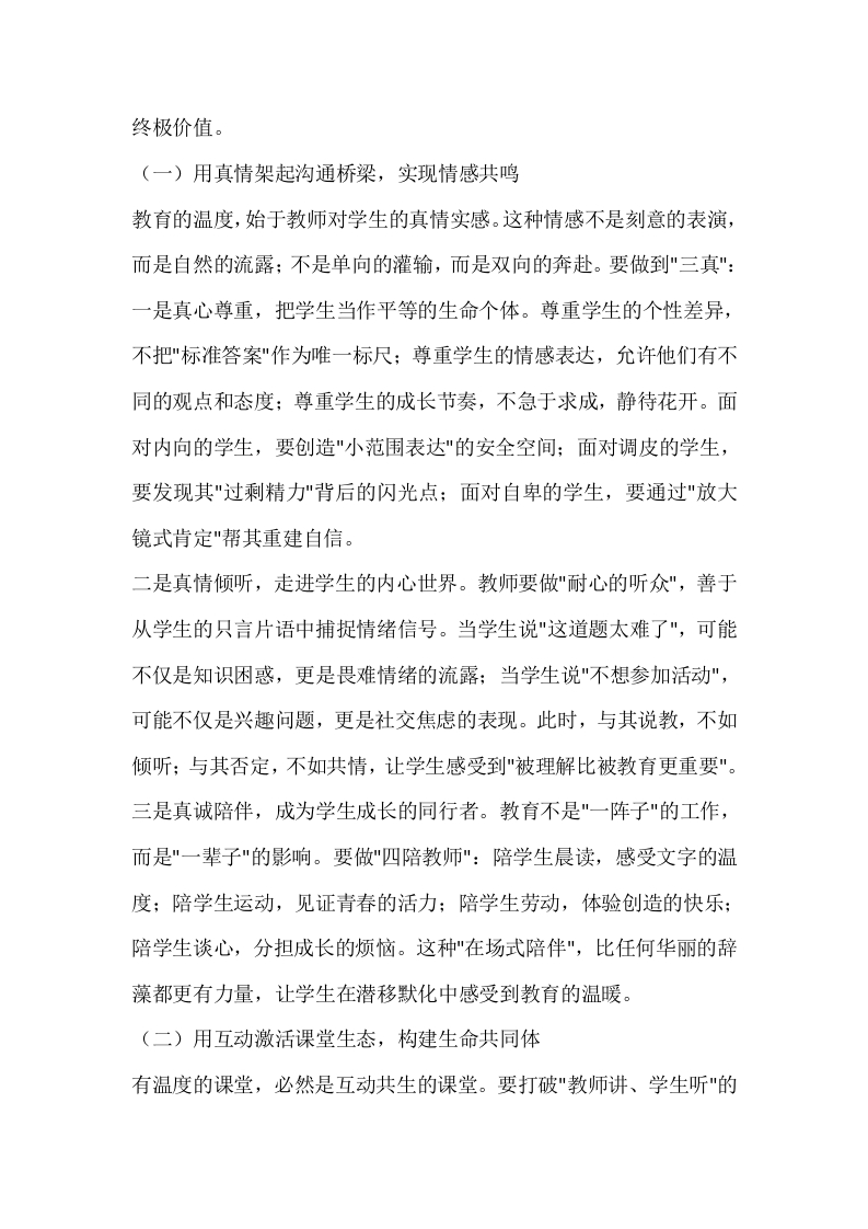 2025年秋季学期教学工作会议,校长讲话:让教育有温度,让学习有深度,让成长有力度晨晨老师2个月前发布关注私信21.82KB13页02910 以下为资料部分截图预览,下载后为超高清原文件。 第1页 / 共13页 第2页 / 共13页 试读已结束,还剩11页,您可下载完整版后进行离线阅读 加入VIP,享海量教务资料,无限制免费下载所有材料 2025年秋季学期教学工作会议,校长讲话:让教育有温度,让学习有深度,让成长有力度此内容为付费资源,请付费后查看¥9.99¥15.99VIP会员免费代理(享70%分佣)免费立即购买您当前未登录!建议登陆后购买,可保存购买订单付费资源© 版权声明文章版权归作者所有,未经允许请勿转载。THE END校长讲话 文本预览 2025年秋季学期教学工作会议,校长讲话:让教育有温度,让学习有深度,让成长有力度各位同仁:金秋时节,丹桂飘香。当我们站在新学期的起点,回望教育改革的壮阔征程,心中既有对过往成绩的欣慰,更有对未来使命的担当。陶行知先生曾言:"教育是心心相印的活动,唯独从心里发出来,才能打动心灵的深处。"在全面建设教育强国的新时代,我们当以怎样的教育理念滋养生命?以怎样的教学实践培育新人?以怎样的改革魄力开创未来?今天,我想围绕"让教育有温度,让学习有深度,让成长有力度"这一主题,与大家共同探讨新时代育人使命的实践路径。这三个"让",既是对教育本质的回归,也是对教学规律的遵循,更是对育人目标的坚守。教育的温度,是师生心灵的相遇:学习的深度,是思维品质的提升;成长的力度,是终身发展的根基。三者相辅相成,共同构成新时代教育高质量发展的核心要义。一、让教育有温度:在心灵相遇中传递生命温暖教育的本质是唤醒,而唤醒的前提是温暖。没有温度的教育,如同没有阳光的春天,难以滋养生命的成长。让教育有温度,需要我们从"知识传授"转向"生命关怀",在师生心灵的真诚相遇中,实现教育的 查看更多 收起部分 喜欢就支持一下吧点赞10 分享QQ空间微博QQ好友海报分享复制链接收藏
