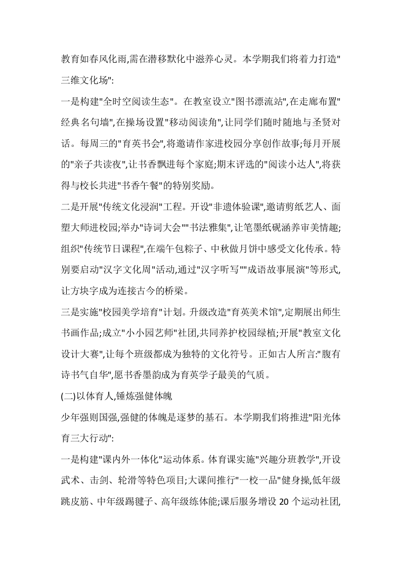 2025小学秋季开学典礼,校长致辞:执梦为笔耕沃土,育英同心向朝阳晨晨老师2个月前发布关注私信17.89KB8页02311 以下为资料部分截图预览,下载后为超高清原文件。 第1页 / 共8页 第2页 / 共8页 试读已结束,还剩6页,您可下载完整版后进行离线阅读 加入VIP,享海量教务资料,无限制免费下载所有材料 2025小学秋季开学典礼,校长致辞:执梦为笔耕沃土,育英同心向朝阳此内容为付费资源,请付费后查看¥9.99¥15.99VIP会员免费代理(享70%分佣)免费立即购买您当前未登录!建议登陆后购买,可保存购买订单付费资源© 版权声明文章版权归作者所有,未经允许请勿转载。THE END校长讲话 文本预览 2025小学秋季开学典礼,校长致辞:执梦为笔耕沃土,育英同心向朝阳尊敬的各位老师、亲爱的同学们:一、秋染校园梦想启航当晨露在梧桐叶尖凝成珍珠,当第一缕霞光为教学楼镀上金边,沉寂了两月的育英园正以崭新的姿态苏醒一一听,教室里传来朗朗书声,操场上跃动着青春身影,连廊间绽放着灿烂笑脸。此刻,我们站在国旗下,共同迎接2025年秋季新学期的到来。首先,请允许我代表学校,向百余名一年级新同学表示最热烈的欢迎!你们像破土的新芽,为育英园注入蓬勃生机:向全体教师致以崇高敬意,感谢你们以匠心守初心,用智慧点亮万千童心;更要为全体同学点赞一一过去一年,你们用勤奋书写成长答卷,用拼搏诠释少年担当!回望来时路,育英园的每一寸土地都镌刻着奋斗足迹:还记得"汉字听写大赛"上,同学们屏息凝神书写方块字时的专注模样:科技节里,"水火箭"腾空而起的瞬间,点燃了多少科学梦想:校园戏剧节《少年中国说》的铿锵台词,至今仍在耳畔回响;还有那些清晨最早亮起灯光的办公室,深夜伏案批改作业的数据身影…这些闪光的记忆,共同编织成育英最动人的成长画卷。今天让我们把掌声送给了不起的自己,也送给这个充满温度的校园!二、深耕厚植筑牢成长根基(一)以文化人,浸润书香墨韵 查看更多 收起部分 喜欢就支持一下吧点赞11 分享QQ空间微博QQ好友海报分享复制链接收藏