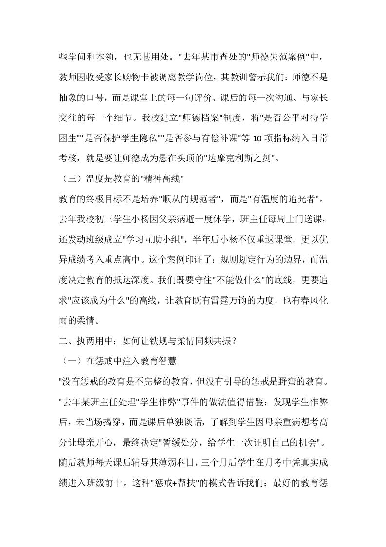 校长在新学期教师培训会上的讲话:教育的方圆之道——在规则中守护成长的温度晨晨老师2个月前发布关注私信15.07KB5页0425 以下为资料部分截图预览,下载后为超高清原文件。 第1页 / 共5页 第2页 / 共5页 试读已结束,还剩3页,您可下载完整版后进行离线阅读 加入VIP,享海量教务资料,无限制免费下载所有材料 校长在新学期教师培训会上的讲话:教育的方圆之道——在规则中守护成长的温度此内容为付费资源,请付费后查看¥9.99¥15.99VIP会员免费代理(享70%分佣)免费立即购买您当前未登录!建议登陆后购买,可保存购买订单付费资源© 版权声明文章版权归作者所有,未经允许请勿转载。THE END校长讲话 文本预览 校长在新学期教师培训会上的讲话:教育的方圆之道一一在规则中守护成长的温度各位老师:大家好!今天我们以"依法执教"为主题开展培训,既是回应教育法治化的时代命题,更是探寻"规则之方"与"教育之圆"的融合之道。所谓方",是法律法规划定的职业底线:所谓"圆",是育人过程中不可或缺的人文温度。如何让铁规有力度、教育有温度?如何在坚守原则中传递关怀?如何让规范管理与个性成长同频共振?今天,让我们以"方圆相济"为钥,共同开启新学期教育实践的新思考。一、明辨方圆:何为教育的底线与高线?(一)规则是不可触碰的"边界线"《教师法》《未成年人保护法》等法律法规,不是束缚教育创新的枷锁,而是守护师生权益的屏障。去年某小学发生的"课堂录像纠纷"引人深思:一位教师为"抓典型",在未告知学生的情况下录制课堂违纪视频并在家长群传播,最终因"侵犯肖像权"被投诉。这提醒我们:教育惩戒必须格守"程序正当"原则一一没有告知的监督是侵权,没有沟通的惩戒是暴力。我校去年修订的《学生管理细则》明确规定:任何涉及学生权益的处理,必须履行"告知-听证-申诉"三步程序,这正是"规则之方"的具体实践。(二)师德是立教兴教的"生命线"教育家陶行知曾说:"道德是做人的根本。根本一坏,纵然使你有一 查看更多 收起部分 喜欢就支持一下吧点赞5 分享QQ空间微博QQ好友海报分享复制链接收藏