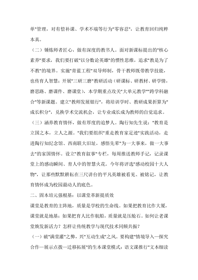 校长在新学期开学教职工大会上的讲话:旧邦新命守初心,杏坛逐梦育英才晨晨老师2个月前发布关注私信19.84KB9页0388 以下为资料部分截图预览,下载后为超高清原文件。 第1页 / 共9页 第2页 / 共9页 试读已结束,还剩7页,您可下载完整版后进行离线阅读 加入VIP,享海量教务资料,无限制免费下载所有材料 校长在新学期开学教职工大会上的讲话:旧邦新命守初心,杏坛逐梦育英才此内容为付费资源,请付费后查看¥9.99¥15.99VIP会员免费代理(享70%分佣)免费立即购买您当前未登录!建议登陆后购买,可保存购买订单付费资源© 版权声明文章版权归作者所有,未经允许请勿转载。THE END校长讲话 文本预览 校长在新学期开学教职工大会上的讲话:旧邦新命守初心,杏坛逐梦育英才老师们:春华秋实又一载,弦歌不辍启新篇。当清晨的第一缕阳光洒满焕然一新的校园,我们既看到携刻着"厚德博学"的校训石巍然矗立,也触摸到智慧黑板投射的科技光芒;既闻到图书馆飘来的墨香,也听见实验室传来的探索声响。这是传统与现代的交响,更是初心与使命的接力。刚才,教务处张主任以"深耕课堂沃士"为题汇报了教学规划,德育处刘主任围绕"铸造时代新人"部署了育人举措,两位同志的思路与学校发展战略高度契合,我完全赞同。今天,我将以"守初心、强根基、育新人、润无声、启新程"为脉络,与大家共话教育的传承与创新。一、溯本求源守初心:以师者仁心铸师魂教育是树摇动树、云推动云的心灵唤醒,是捧着一颗心来、不带半根草去的无私奉献。在功利思潮暗流涌动的今天,我们更需叩问初心:教育的本真是什么?教师的使命何在?(一)执守育人初心,做有温度的教育者。去年冬天,李老师冒雪送生病学生去医院的事迹在家长群刷屏,家长留言"遇见这样的老师是孩子一生的幸运"。这提醒我们:教育的真谛永远是爱与责任。要开展"三问三答"师德专题教育:"假如我是孩子"假如是我的孩子"我要成为怎样的老师",通过师德故事会、育人案例大赛等形式,让"学高为师、身正为范"融入血脉。建立"师德档案"电子系统,实行"负面清 查看更多 收起部分 喜欢就支持一下吧点赞8 分享QQ空间微博QQ好友海报分享复制链接收藏
