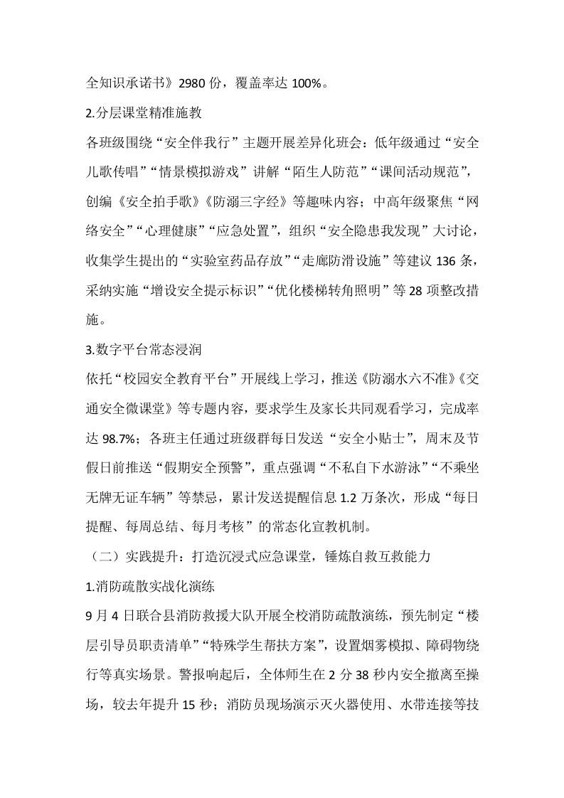 学校2025秋季新学期开学工作暨安全教育活动开展情况汇报:三维度筑牢安全屏障,四聚焦提升开学效能晨晨老师2个月前更新关注私信18.17KB9页05115 以下为资料部分截图预览,下载后为超高清原文件。 第1页 / 共9页 第2页 / 共9页 试读已结束,还剩7页,您可下载完整版后进行离线阅读 加入VIP,享海量教务资料,无限制免费下载所有材料 © 版权声明文章版权归作者所有,未经允许请勿转载。THE END安全活动校长讲话 文本预览 学校2025秋季新学期开学工作暨安全教育活动开展情况汇报:三维度筑牢安全屏障,四聚焦提升开学效能尊敬的各位领导:教育是国之大计、党之大计,学校作为立德树人的主阵地,肩负着培养德智体美劳全面发展的社会主义建设者和接班人的重要使命。2025年秋季新学期,我校深入贯彻落实教育部及省市县教育工作会议精神,坚持以习近平新时代中国特色社会主义思想为指导,围绕“安全稳校、质量立校、特色强校”发展目标,以“三维度筑牢安全屏障”为抓手深化安全教育,以“四聚焦提升开学效能”为路径统筹推进各项工作,实现新学期教育教学良好开局。现将具体情况汇报如下:一、三维度筑牢安全屏障,构建全链条安全教育体系(一)认知强化:构建全覆盖宣教网络,夯实安全思想根基1.主题集会引领方向9月1日开学首日,以升国旗仪式为契机开展“安全护航成长”主题教育,校长以“生命至上、安全第一”为核心,结合“防溺水、交通出行、校园活动、食品安全”四大领域典型案例,通过“案例警示+法规解读+互动问答”形式,为全体师生上好学年“安全第一课”。学生代表发起“安全文明倡议书”,带领3200余名学生宣誓“遵守校规校纪,远离危险行为,守护生命安全,争做文明学子”,现场回收《安 查看更多 收起部分 喜欢就支持一下吧点赞15 分享QQ空间微博QQ好友海报分享复制链接收藏