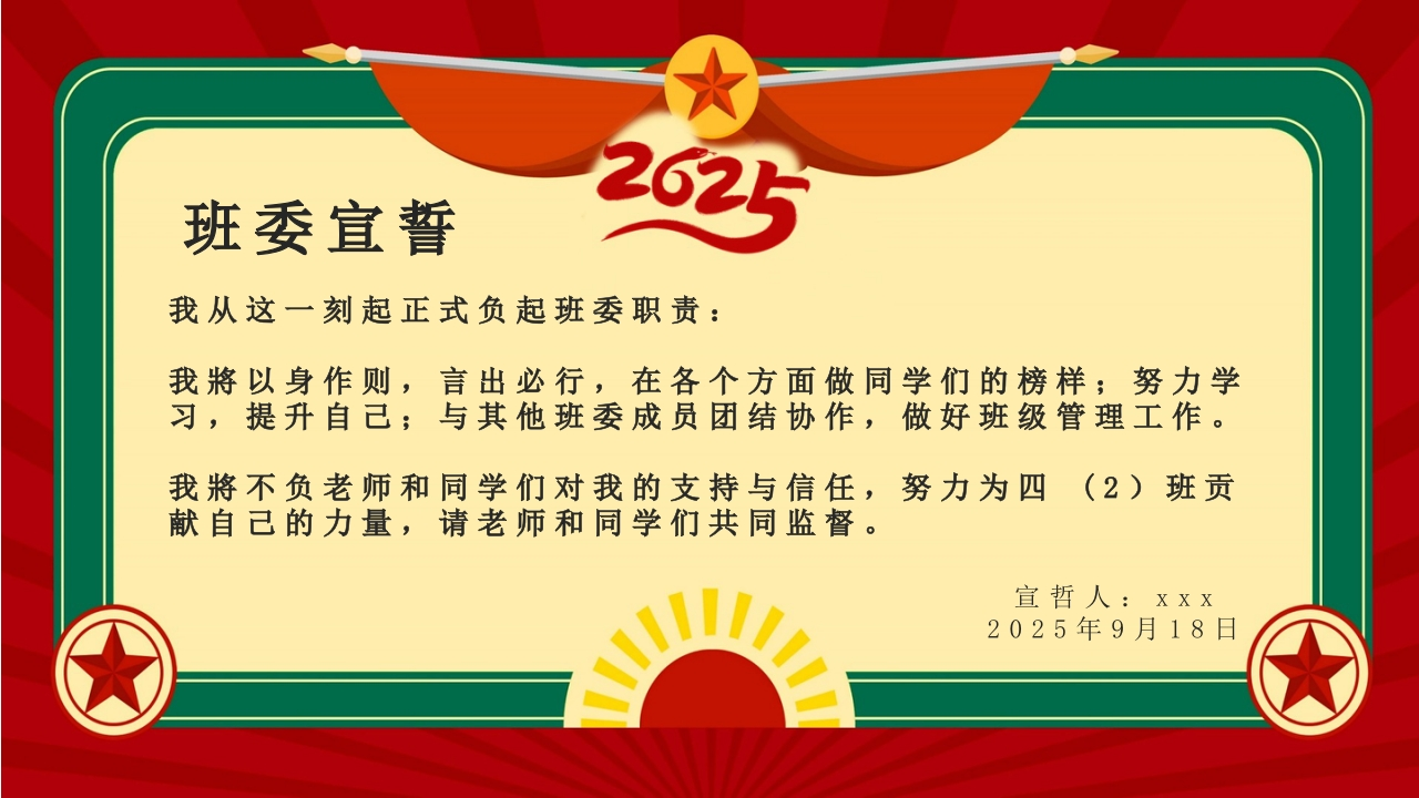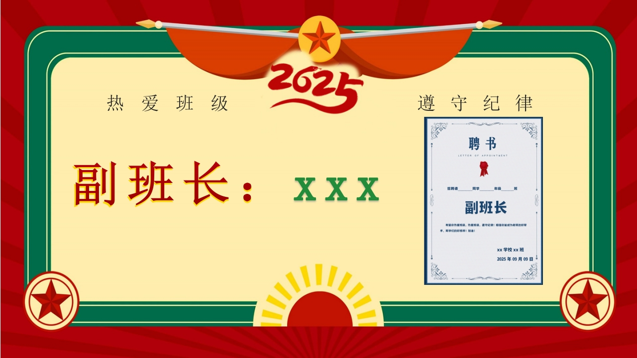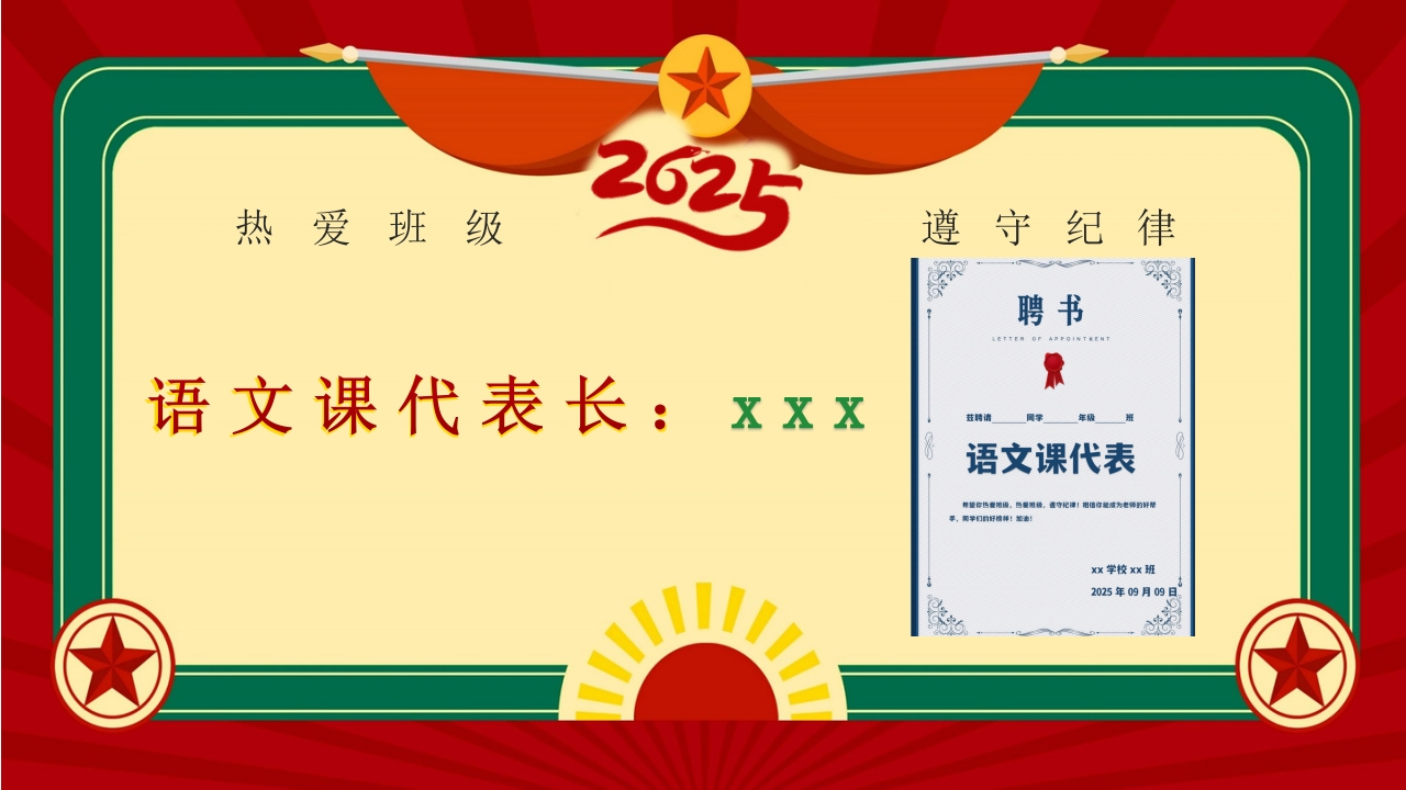 2025-班干部聘任仪式晨晨老师2个月前发布关注私信43.76MB10页05915 以下为资料部分截图预览,下载后为超高清原文件。 第1页 / 共10页 第2页 / 共10页 第3页 / 共10页 第4页 / 共10页 第5页 / 共10页 第6页 / 共10页 第7页 / 共10页 第8页 / 共10页 第9页 / 共10页 第10页 / 共10页 已完成全部阅读,共10页 加入VIP,享海量教务资料,无限制免费下载所有材料 2025-班干部聘任仪式此内容为付费资源,请付费后查看¥9.99¥15.99VIP会员免费代理(享70%分佣)免费立即购买您当前未登录!建议登陆后购买,可保存购买订单付费资源© 版权声明文章版权归作者所有,未经允许请勿转载。THE END其他PPT综合资料 文本预览 2635热爱班级遵守纪律班干部聘任仪式2025学年·秋季新学期聘任仪式 查看更多 收起部分 喜欢就支持一下吧点赞15 分享QQ空间微博QQ好友海报分享复制链接收藏