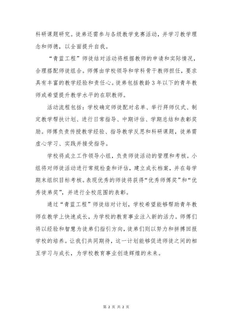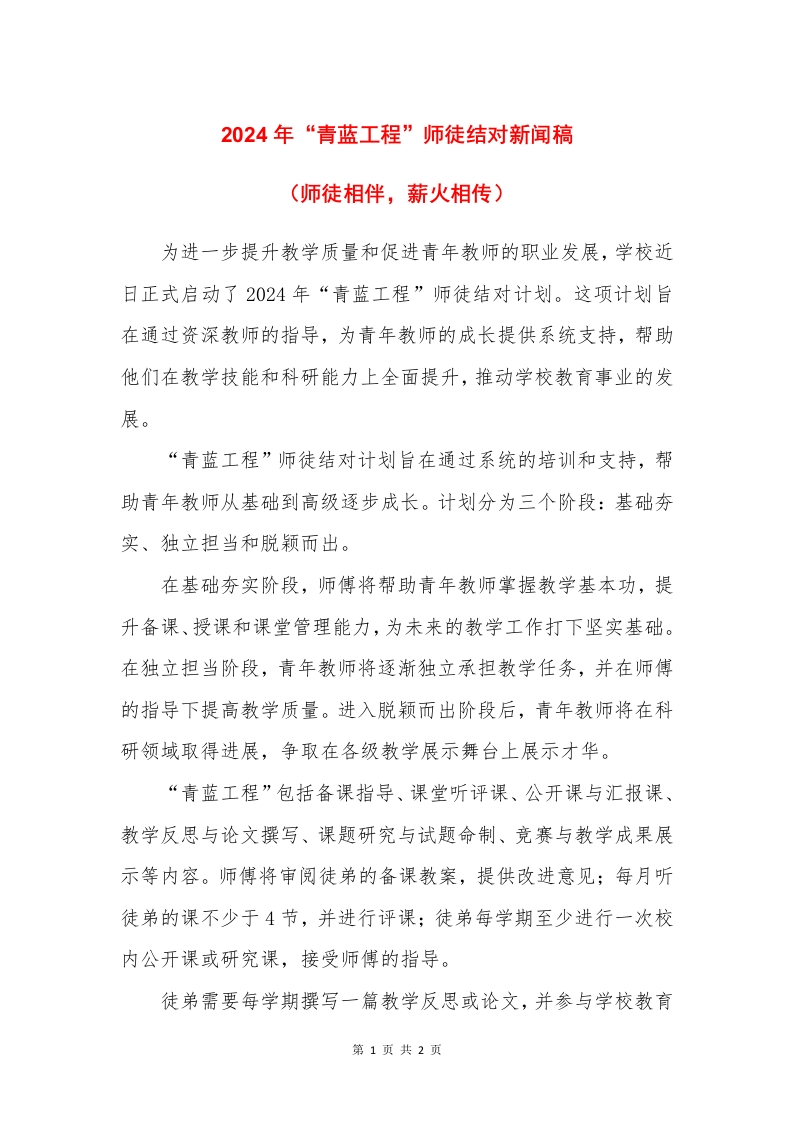 2024年“青蓝工程”师徒结对新闻稿(师徒相伴,薪火相传)为进一步提升教学质量和促进青年教师的职业发展,学校近日正式启动了2024年“青蓝工程”师徒结对计划。这项计划旨在通过资深教师的指导,为青年教师的成长提供系统支持,帮助他们在教学技能和科研能力上全面提升,推动学校教育事业的发展。“青蓝工程”师徒结对计划旨在通过系统的培训和支持,帮助青年教师从基础到高级逐步成长。计划分为三个阶段:基础夯实、独立担当和脱颖而出。在基础夯实阶段,师傅将帮助青年教师掌握教学基本功,提升备课、授课和课堂管理能力,为未来的教学工作打下坚实基础。在独立担当阶段,青年教师将逐渐独立承担教学任务,并在师傅的指导下提高教学质量。进入脱颖而出阶段后,青年教师将在科研领域取得进展,争取在各级教学展示舞台上展示才华。“青蓝工程”包括备课指导、课堂听评课、公开课与汇报课、教学反思与论文撰写、课题研究与试题命制、竞赛与教学成果展示等内容。师傅将审阅徒弟的备课教案,提供改进意见;每月听徒弟的课不少于4节,并进行评课:徒弟每学期至少进行一次校内公开课或研究课,接受师傅的指导。徒弟需要每学期撰写一篇教学反思或论文,并参与学校教育第1页共2页
