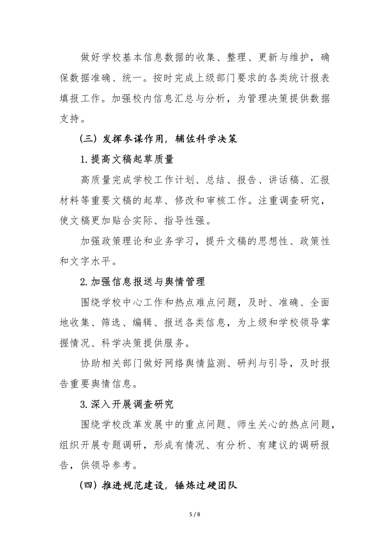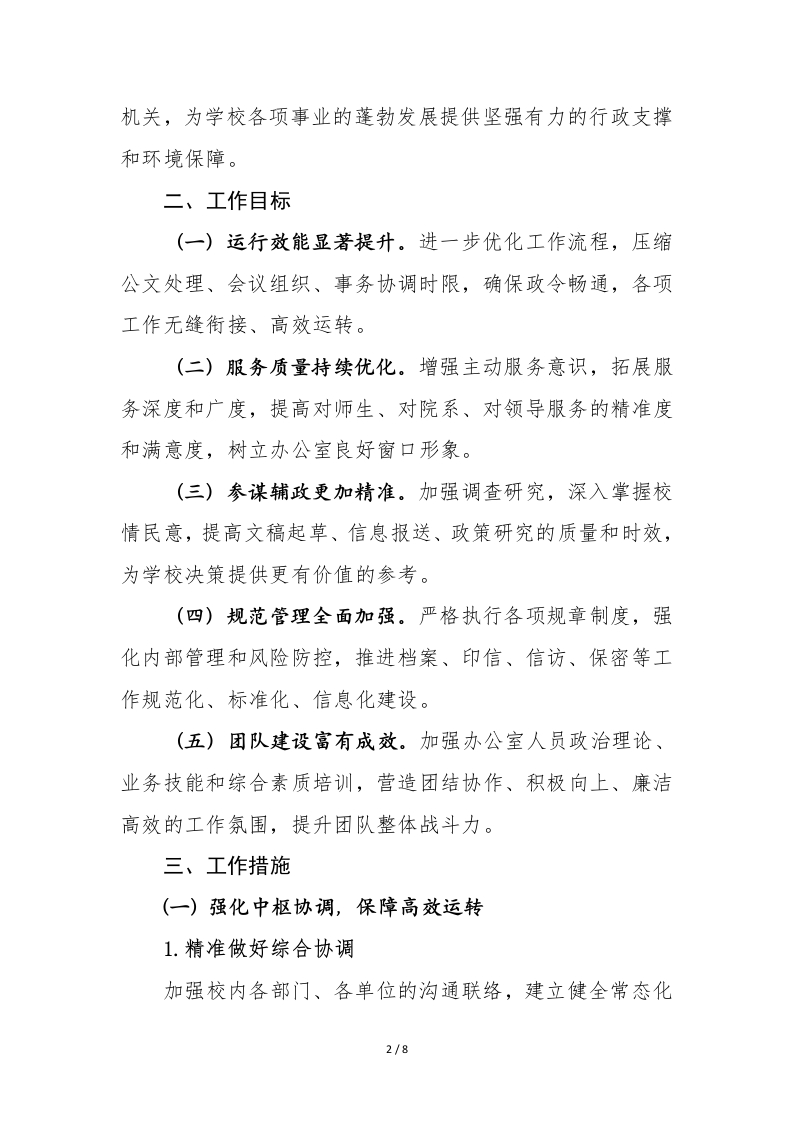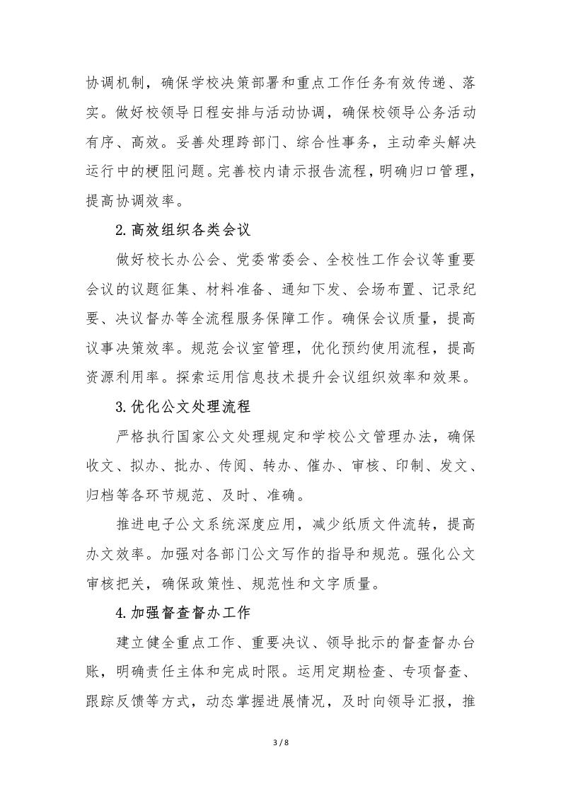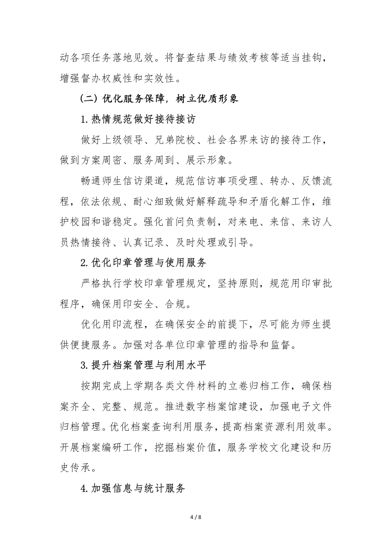 2025-2026学年第一学期学校办公室工作计划——凝心聚力启新程真抓实干绘新篇晨晨老师2个月前更新关注私信0.31MB8页0239 以下为资料部分截图预览,下载后为超高清原文件。 第1页 / 共8页 第2页 / 共8页 第3页 / 共8页 第4页 / 共8页 第5页 / 共8页 试读已结束,还剩3页,您可下载完整版后进行离线阅读 加入VIP,享海量教务资料,无限制免费下载所有材料 © 版权声明文章版权归作者所有,未经允许请勿转载。THE END计划总结 文本预览 2025-2026学年第一学期学校办公室工作计划凝心聚力启新程真抓实干绘新篇具体措施(一)强化中枢协调,保障高效运转(二)优化服务保障,树立优质形象(三)发挥参谋作用,辅佐科学决策(四)推进规范建设,锤炼过硬团队秋来开新局,奋起新征程。本学期,是学校深入实施“十四五”发展规划承上启下的关键学期,也是巩固拓展教育教学改革成果、全面提升治理效能的重要阶段。学校办公室作为学校的综合协调、服务保障中枢机构,肩负着承上启下、联系左右、协调内外、服务全局的重任。为确保新学期各项工作高效、有序、规范运行,更好地服务于学校发展大局和师生需求,特制定本工作计划。一、指导思想本学期,办公室工作将坚持以学校整体发展战略为引领,紧密围绕学校中心工作和重点任务,牢固树立“规范、高效、精细、创新、服务”的工作理念。以提升内部治理现代化水平为核心,以强化执行力、协调力、保障力为重点,以优化工作流程、创新服务模式为动力,充分发挥参谋助手、综合协调、督查督办、服务保障的职能作用,努力打造运转高效、管理规范、服务优质、作风过硬的学习型、服务型、效能型1/8 查看更多 收起部分 喜欢就支持一下吧点赞9 分享QQ空间微博QQ好友海报分享复制链接收藏