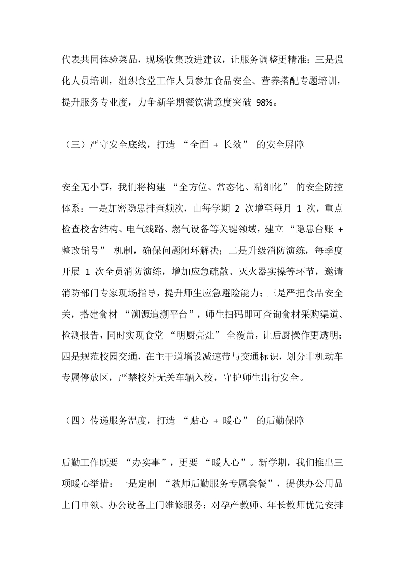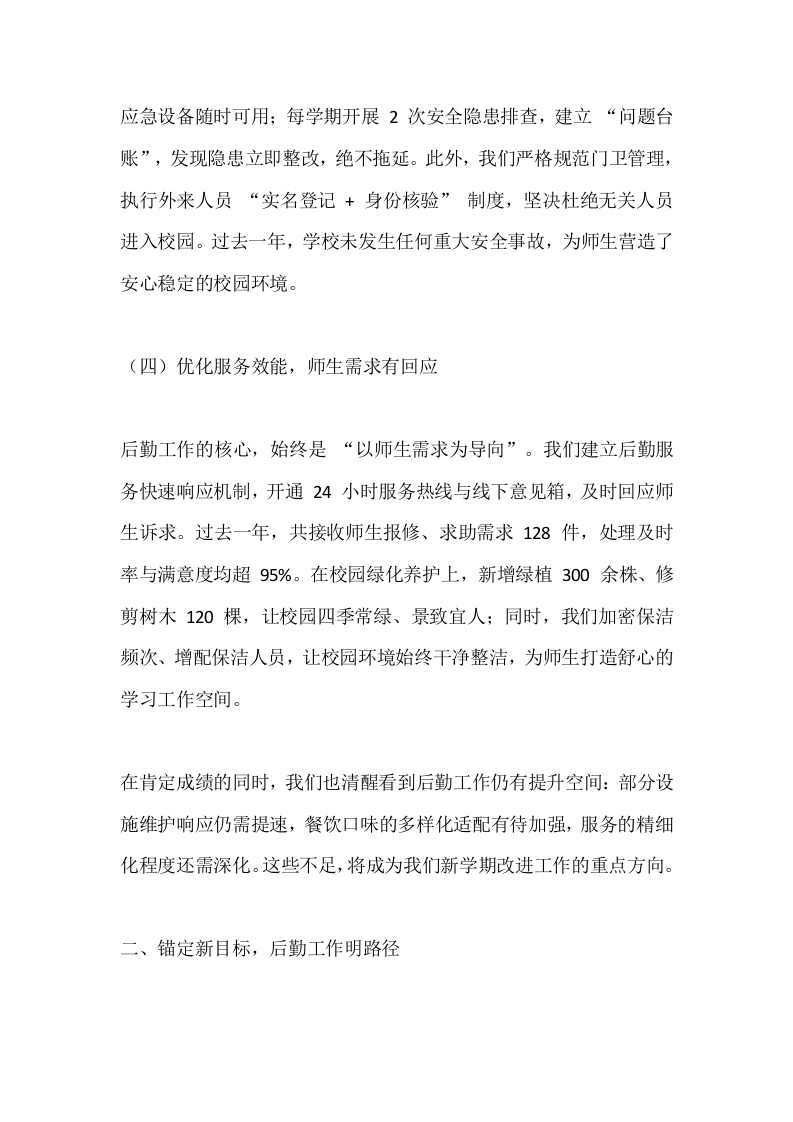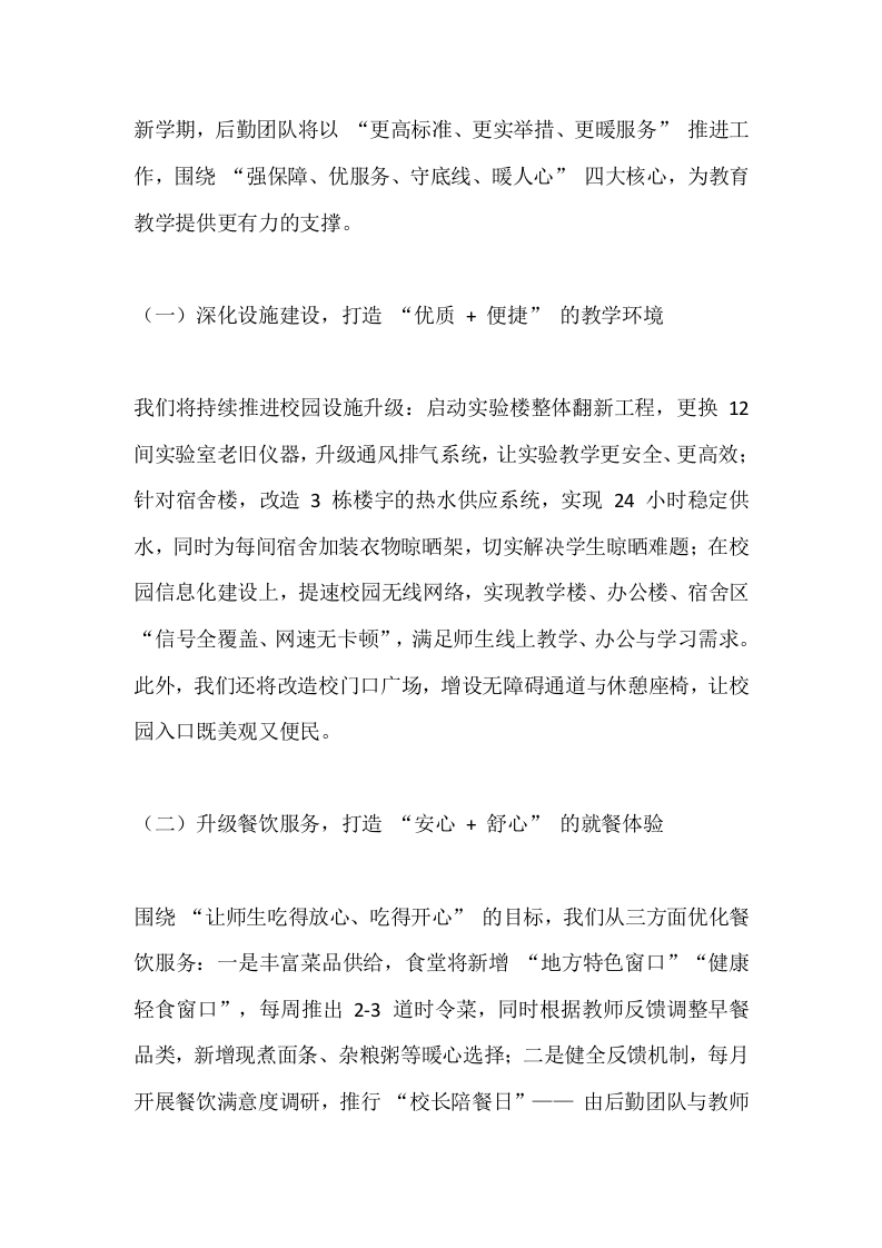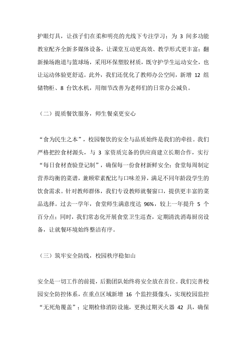 2025年秋季开学第一次全体教师大会,后勤副校长讲话:以后勤之力护教育之航晨晨老师2个月前发布关注私信16.35KB7页0289 以下为资料部分截图预览,下载后为超高清原文件。 第1页 / 共7页 第2页 / 共7页 第3页 / 共7页 第4页 / 共7页 第5页 / 共7页 试读已结束,还剩2页,您可下载完整版后进行离线阅读 加入VIP,享海量教务资料,无限制免费下载所有材料 2025年秋季开学第一次全体教师大会,后勤副校长讲话:以后勤之力护教育之航此内容为付费资源,请付费后查看¥9.99¥15.99VIP会员免费代理(享70%分佣)免费立即购买您当前未登录!建议登陆后购买,可保存购买订单付费资源© 版权声明文章版权归作者所有,未经允许请勿转载。THE END校长讲话 文本预览 2025年秋季开学第一次全体教师大会,后勤副校长讲话:以后勤之力护教育之航尊敬的各位老师:大家好!金秋九月,丹桂盈香。在这满载收获与期许的时节,我们再度相聚于熟悉的校园,共同拉开2025年秋季学期的序幕。作为分管后勤工作的副校长,今日能与各位一同回望过往、擘画未来,我既感荣幸,更知责任深重。后勤工作是学校发展的“压舱石”,更是教育教学有序推进的“生命线”。在此,我谨代表后勤团队,向每一位辛勤耕耘的同仁致以诚挚问候!也向新加入我校的7位老师表示热烈欢迎一一期待与你们并肩同行,共赴教育新程!一、回望来时路,后勤担当见真章过去一学年,后勤团队始终以“服务教育初心、护航教学主业”为导向,在平凡岗位上深耕细作,为学校稳定发展筑牢了坚实根基。(一)升级设施硬件,教学环境焕新颜我们深知,优质的环境是育人的重要基石。过去一年,多项设施升级工程落地见效:完成教学楼28间教室照明改造,全量更换为无频闪 查看更多 收起部分 喜欢就支持一下吧点赞9 分享QQ空间微博QQ好友海报分享复制链接收藏