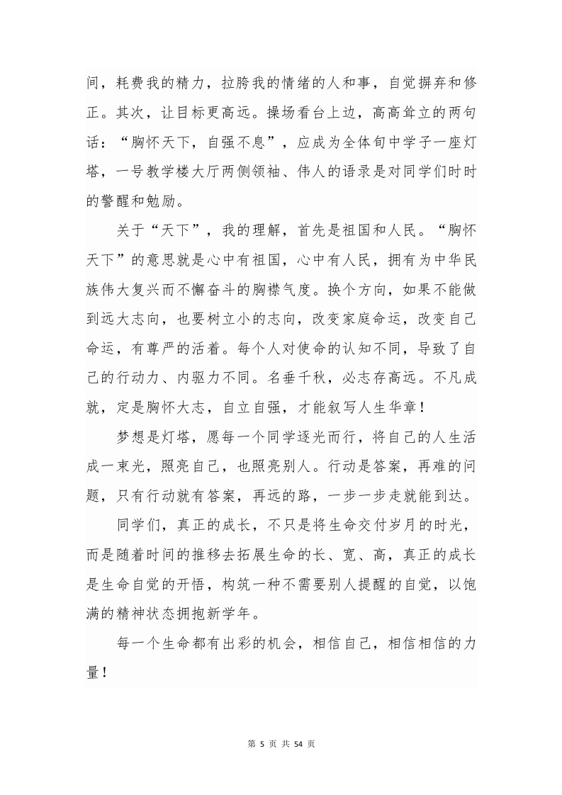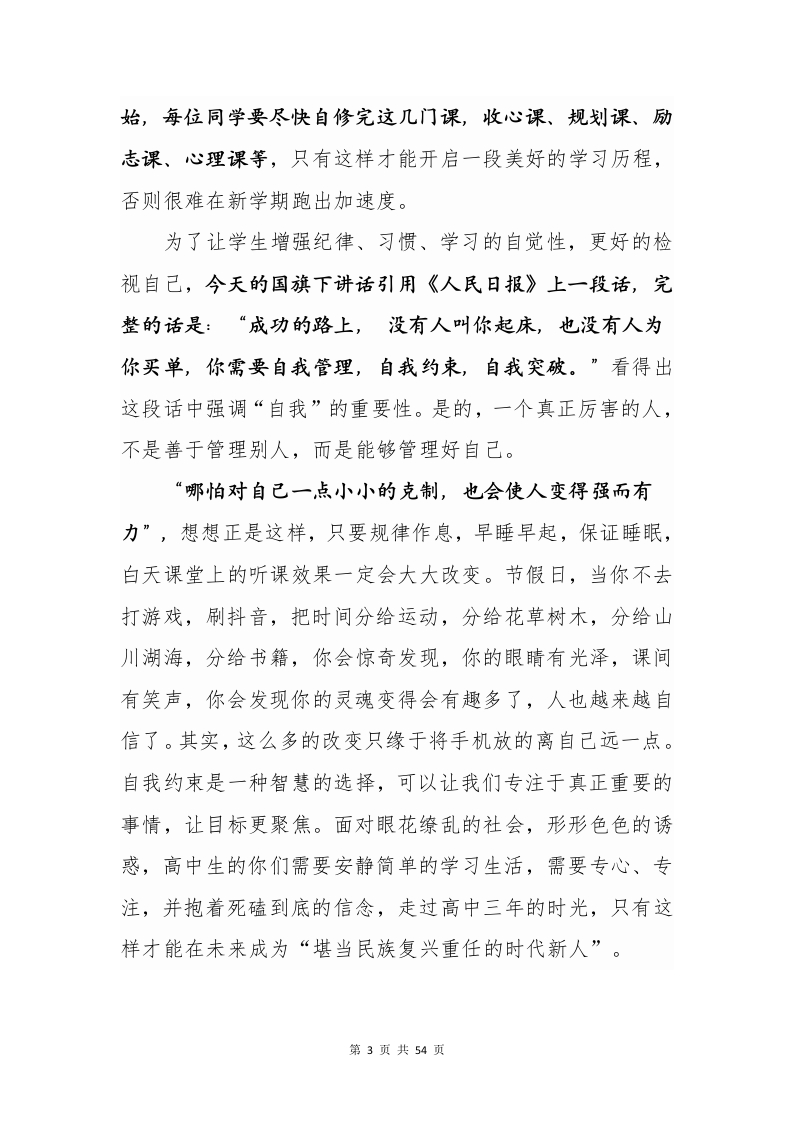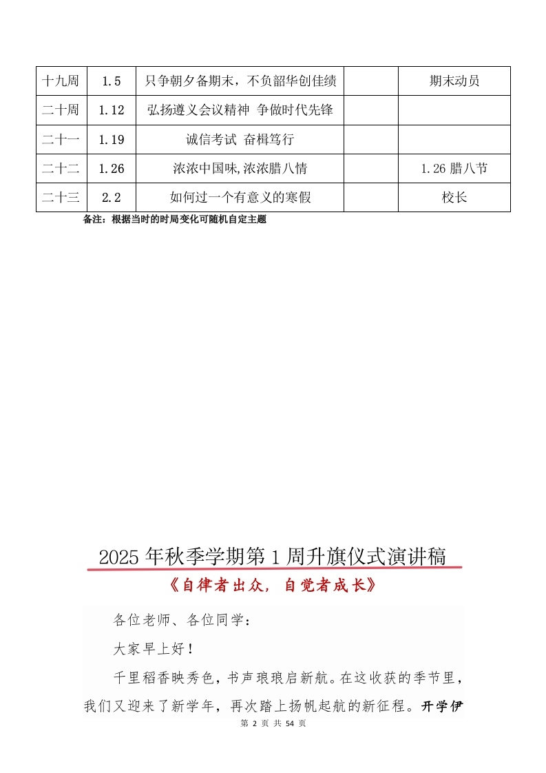 2025年秋季学期升旗仪式安排表及演讲稿晨晨老师2个月前发布关注私信0.85MB54页0358 以下为资料部分截图预览,下载后为超高清原文件。 第1页 / 共54页 第2页 / 共54页 第3页 / 共54页 第4页 / 共54页 第5页 / 共54页 试读已结束,还剩49页,您可下载完整版后进行离线阅读 加入VIP,享海量教务资料,无限制免费下载所有材料 2025年秋季学期升旗仪式安排表及演讲稿此内容为付费资源,请付费后查看¥9.99¥15.99VIP会员免费代理(享70%分佣)免费立即购买您当前未登录!建议登陆后购买,可保存购买订单付费资源© 版权声明文章版权归作者所有,未经允许请勿转载。THE END校长讲话 文本预览 2025年秋季升旗仪式班队会主题安排表及国旗下演讲稿(本学期23周,共23篇演讲稿)周次日期升旗仪式/班队会主题黑板报备注第一周9.1自律者出众,自觉者成长开学日一收心第二周9.8感恩教师,爱满校园9.10教师节第三周9.15勿忘国耻,振兴中华九一八纪念日第四周9.22金秋时节话秋分,文化传承正当时9.23秋分第五周9.29喜迎国庆,欢度中秋国庆/中秋第六周10.6国庆节/中秋季假期假期中~第七周10.13队员建队续前行,领巾胸前风飘扬10.13建队日第八周10.20致敬抗美援朝争做时代新人10.25抗美援朝纪念日第九周10.27一种永不过时的美德10.31世界勤俭日第十周11.3消防记心中,安全伴一生11.9全国消防日十一周11.10弘扬集体主义争做时代新人集体主义教育十二周11.17在问候中传递爱与温暖11.21世界问候日十三周11.24心怀感恩,行有所敬11.27感恩节十四周12.1弘扬法治精神,争做法制少年12.4全国法制宣传日十五周12.8铭记国家公祭日,厚植爱国情怀12.13国家公祭日十六周12.15感知风俗情暖冬至12.21冬至日十七周12.22心有暖阳,便无惧风雨心理健康十八周12.29以梦为“马”,喜迎新年1.1元旦节第1页共54页 查看更多 收起部分 喜欢就支持一下吧点赞8 分享QQ空间微博QQ好友海报分享复制链接收藏