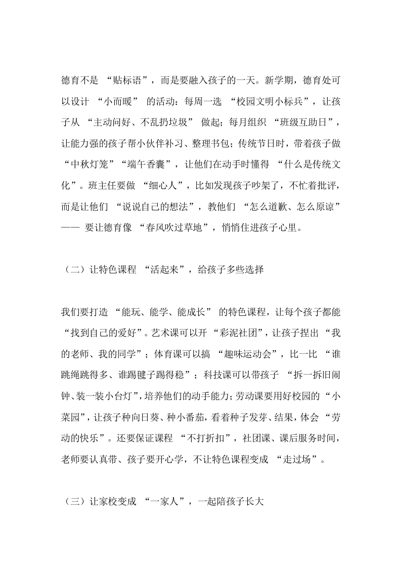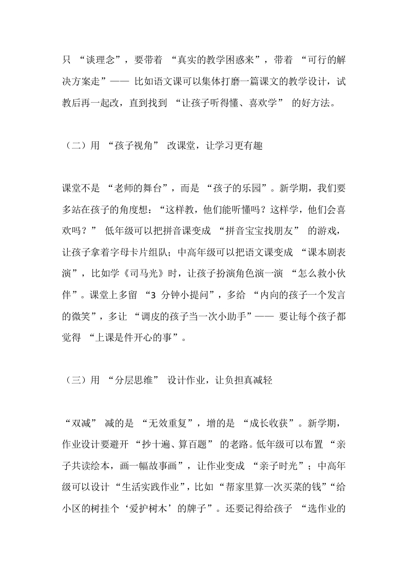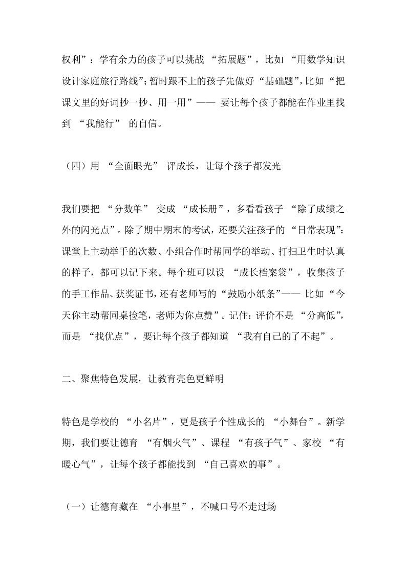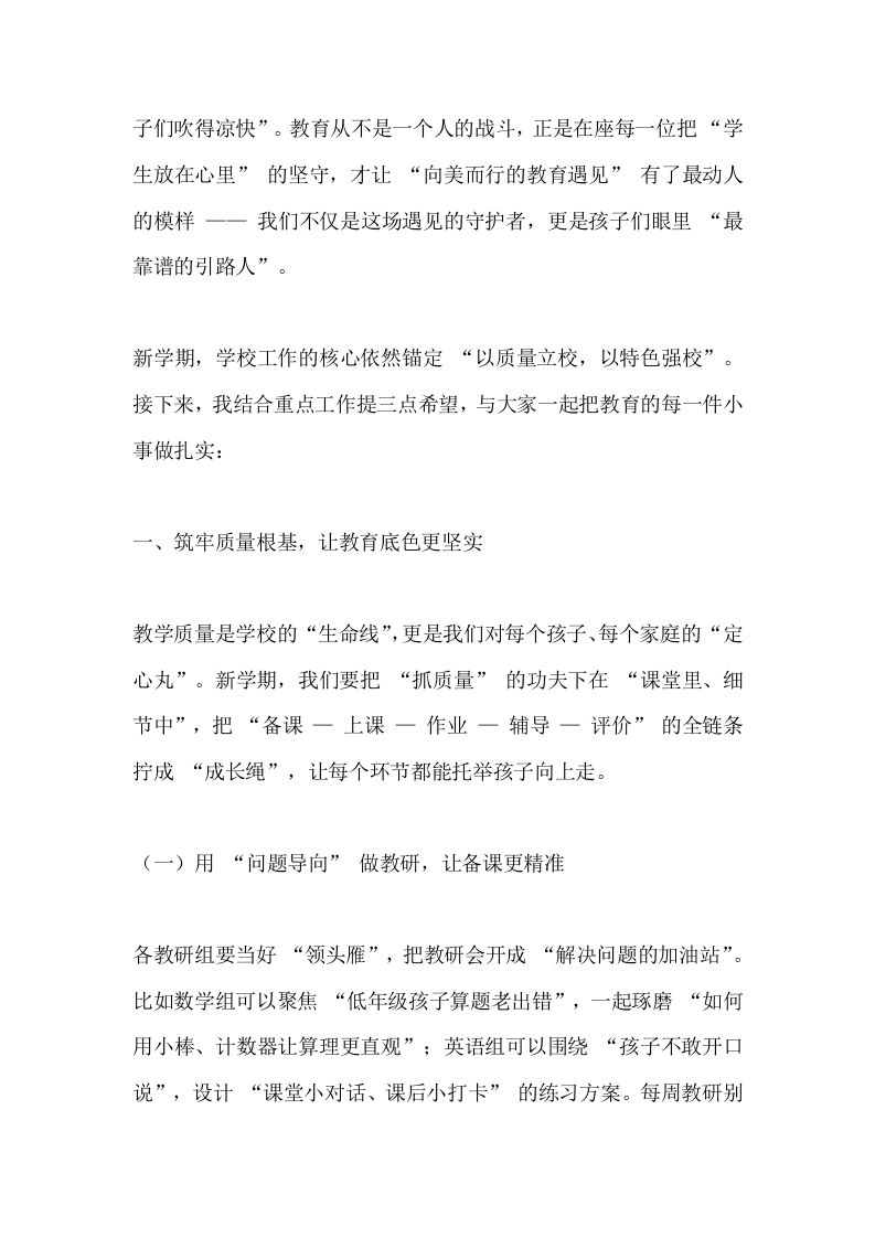 2025秋季学期教职工大会,小学校长精彩讲话:抓质量、创特色,让教育满是温度晨晨老师2个月前发布关注私信16.29KB7页03614 以下为资料部分截图预览,下载后为超高清原文件。 第1页 / 共7页 第2页 / 共7页 第3页 / 共7页 第4页 / 共7页 第5页 / 共7页 试读已结束,还剩2页,您可下载完整版后进行离线阅读 加入VIP,享海量教务资料,无限制免费下载所有材料 2025秋季学期教职工大会,小学校长精彩讲话:抓质量、创特色,让教育满是温度此内容为付费资源,请付费后查看¥9.99¥15.99VIP会员免费代理(享70%分佣)免费立即购买您当前未登录!建议登陆后购买,可保存购买订单付费资源© 版权声明文章版权归作者所有,未经允许请勿转载。THE END校长讲话 文本预览 2025秋季学期教职工大会,小学校长精彩讲话:抓质量、创特色,让教育满是温度各位亲爱的同仁:大家上午好!当晨光漫过教学楼的窗棂,当操场的跑道又迎来第一缕朝阳,我们再次相聚在这方充满童真的校园,共同按下2025年秋季学期的“启动键”。每一次开学,都不只是时光的简单接续一一它是我们重新握紧“育人初心”的约定,是我们带着孩子们奔赴新成长的起点。在此,我代表学校,向每一位坚守讲台、守护孩子的教职工道一声“新学期辛苦了”;更要向暑假里默默付出的同仁们深深鞠躬:是你们的忙碌,让校园始终保持着“等孩子回家”的温暖模样。这个暑假,校园虽少了孩子们的追逐打闹,却藏着太多“为教育蓄力”的小故事。我见过,语文组的老师捧着新课标手册在图书馆研磨单元设计,笔记本上记满了“如何让三年级孩子读懂童话里的道理”;我见过,教学处的同事顶着烈日去校外考察实践基地,只为给孩子们找一处能观察农作物的“自然课堂”;我更见过,后勤师傅踩着梯子检修教室的吊扇,汗水打湿了工服却笑着说“开学要让孩 查看更多 收起部分 喜欢就支持一下吧点赞14 分享QQ空间微博QQ好友海报分享复制链接收藏