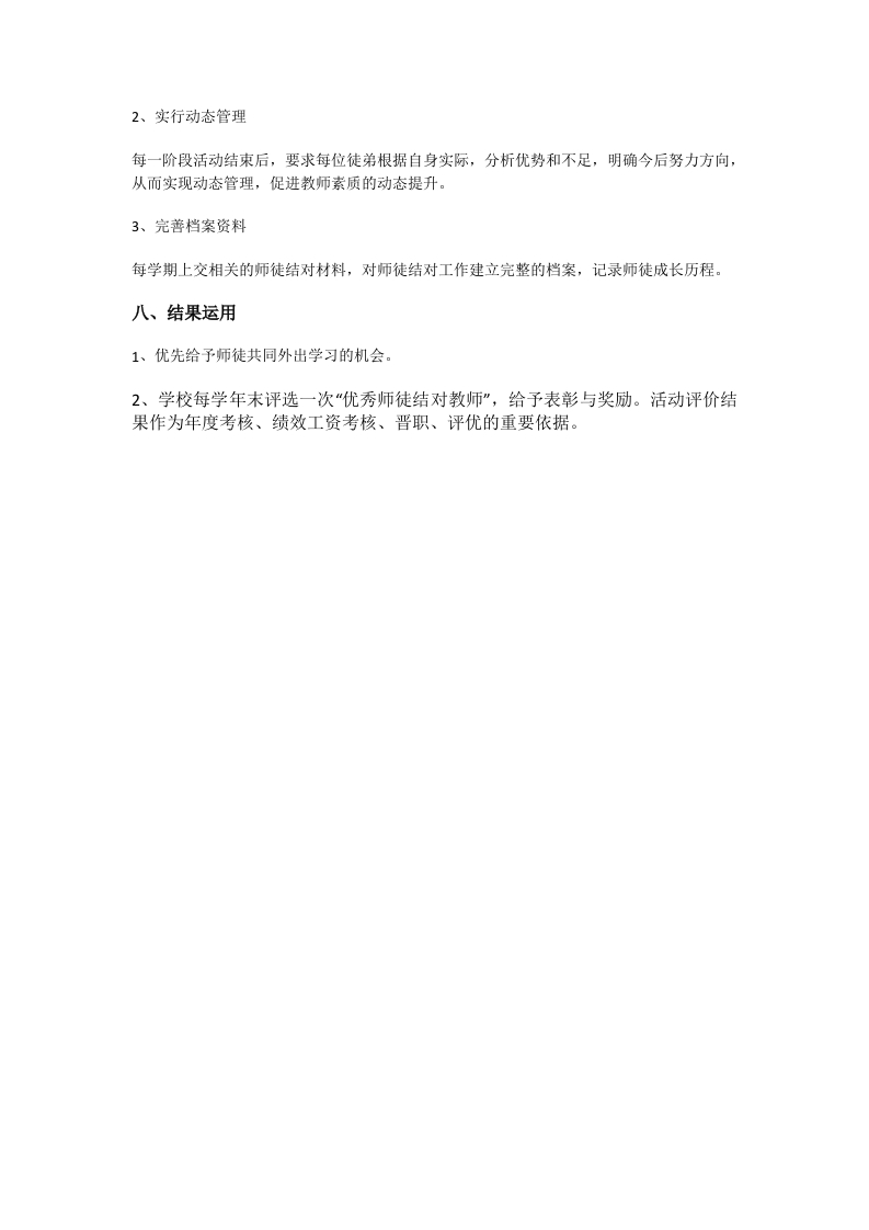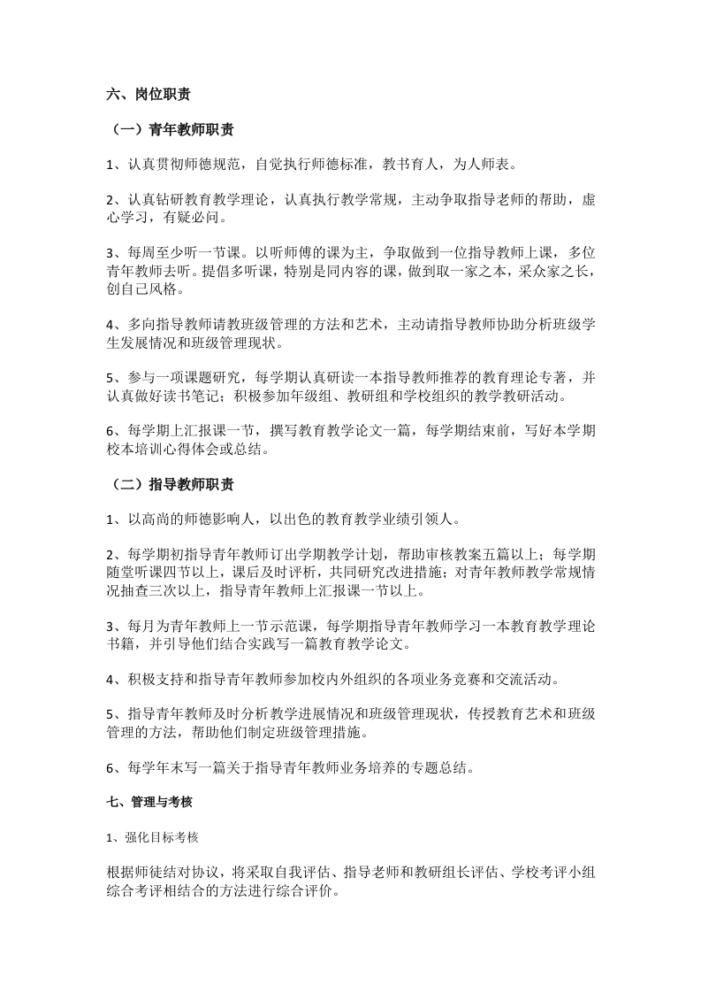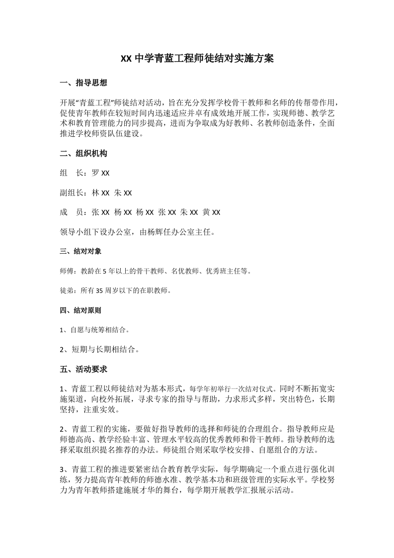 XX中学青蓝工程师徒结对实施方案一、指导思想开展“青蓝工程”师徒结对活动,旨在充分发挥学校骨干教师和名师的传帮带作用,促使青年教师在较短时间内迅速适应并卓有成效地开展工作,实现师德、教学艺术和教育管理能力的同步提高,进而为争取成为好教师、名教师创造条件,全面推进学校师资队伍建设。二、组织机构组长:罗X副组长:林X朱X成员:张x杨x杨x张x朱x黄x领导小组下设办公室,由杨辉任办公室主任。三、结对对象师傅:教龄在5年以上的骨干教师、名优教师、优秀班主任等。徒弟:所有35周岁以下的在职教师。四、结对原则1、自愿与统筹相结合。2、短期与长期相结合。五、活动要求1、青蓝工程以师徒结对为基本形式,每学年初举行一次结对仪式。同时不断拓宽实施渠道,向校外拓展,寻求专家的指导与帮助,力求形式多样,突出特色,长期坚持,注重实效。2、青蓝工程的实施,要做好指导教师的选择和师徒的合理组合。指导教师应是师德高尚、教学经验丰富、管理水平较高的优秀教师和骨干教师。指导教师的选择采取组织提名推荐的办法。师徒组合则采取学校安排、自愿组合的方法。3、青蓝工程的推进要紧密结合教育教学实际,每学期确定一个重点进行强化训练,努力提高青年教师的师德水准、教学基本功和班级管理的实际水平。学校努力为青年教师搭建施展才华的舞台,每学期开展教学汇报展示活动。