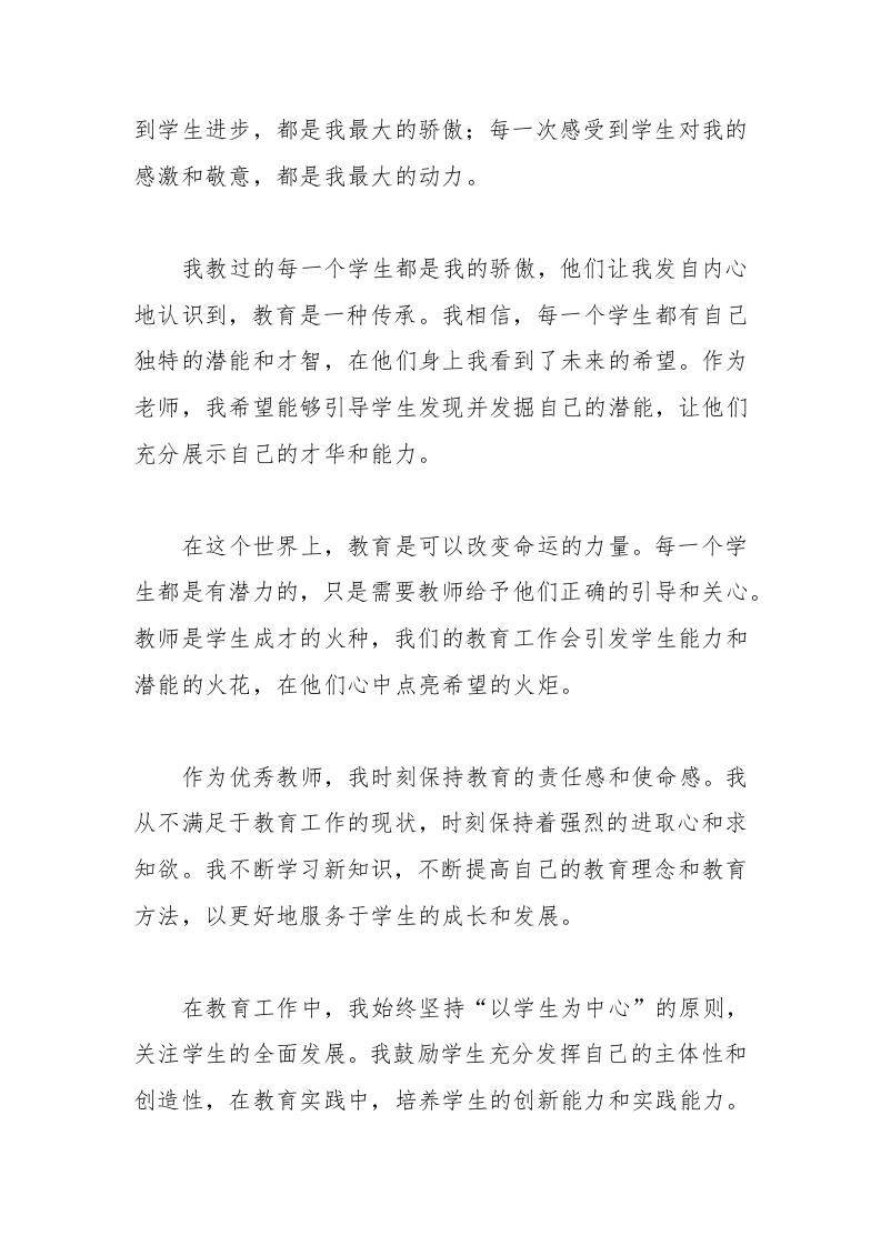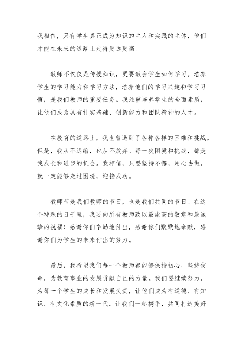 教师节优秀教师发言稿参考范文尊敬的校长、教务处老师,亲爱的同事们:大家好!今天,我站在这里,代表全体教师,向所有教育事业的奋斗者们致以最诚挚的敬意!衷心祝福每一个辛勤付出的教师,祝福大家教师节快乐!教育,是最崇高的事业,教师,是最可爱的人。在这个特殊的日子里,我们欣喜和自豪,因为我们从事着这份神圣而伟大的事业,教育。在辛勤耕耘的道路上,我们用智慧和汗水播种希望,用心灵和爱心培育未来。作为一名教师,我时刻明白自己身上肩负着责任和使命。教师是学生的导航,是他们的榜样,是他们的引路人。我们肩负着为学生成长做出贡献的重任,我们的每一个举动、每一句话语,都会深深地影响着学生的成长。回首过去,我不禁想起了自己在教育岗位上的一些经历和体会。每一次让学生成功,都是我最大的幸福:每一次看