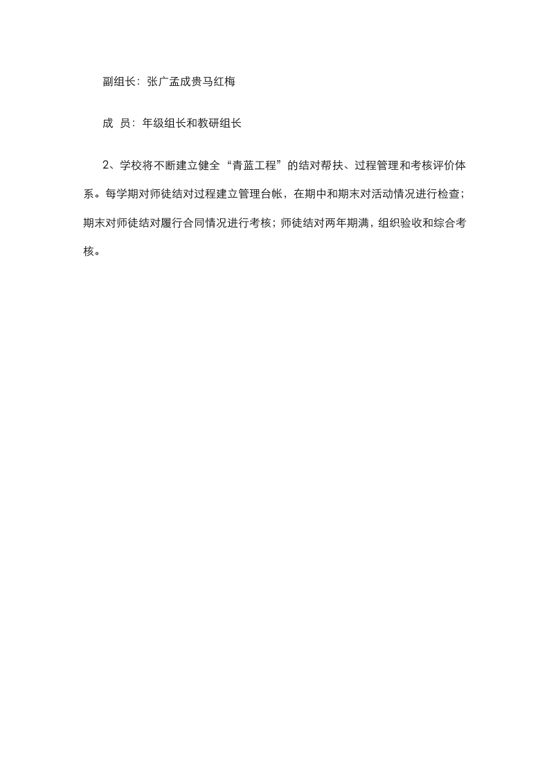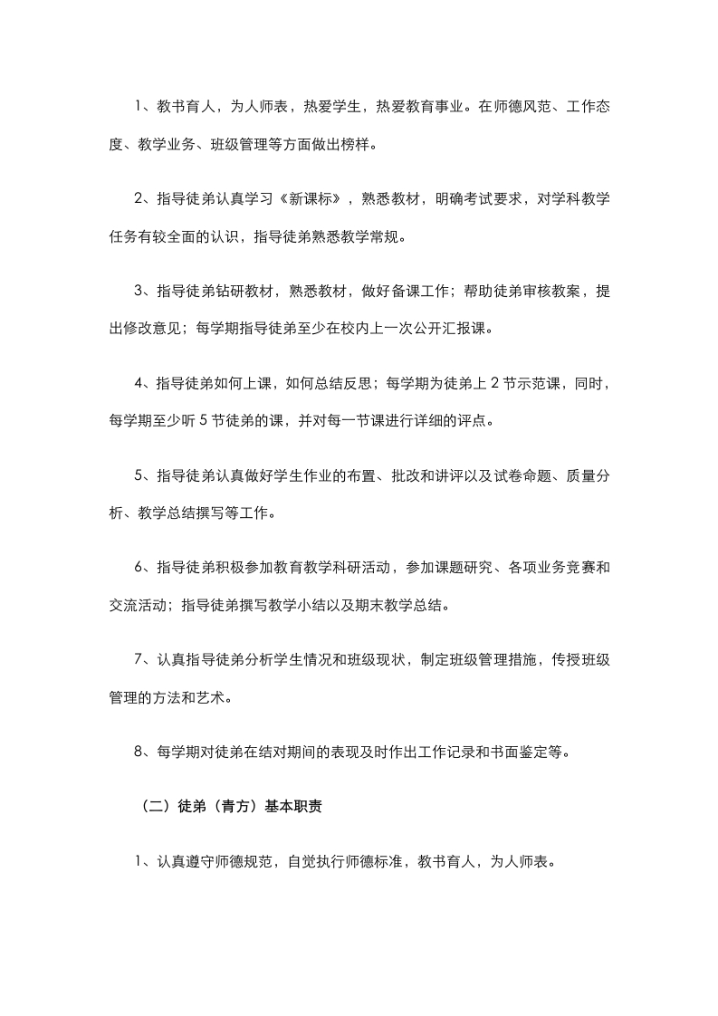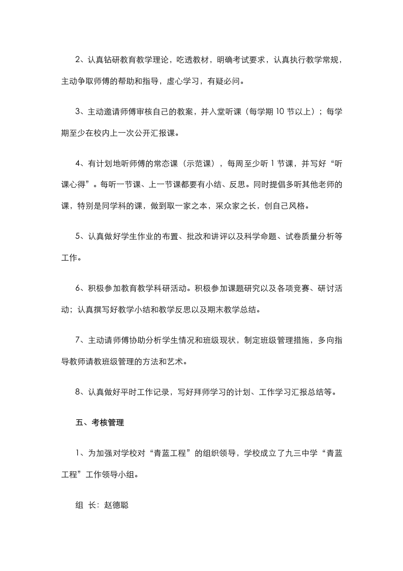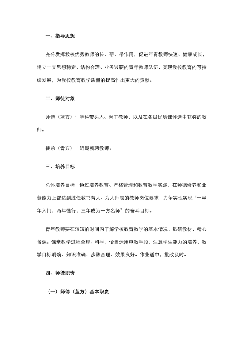 学校青蓝工程师徒结对工作实施方案目录一、指导思想…1二、师徒对象…2三、培养目标…2四、师徒职责“…2(一)师傅(蓝方)基本职责…3(二)徒弟(青方)基本职责…3五、考核管理…4为了充分发挥我校骨干教师的引领作用,帮助新教师尽快适应教育教学工作,掌握先进的教育思想、教学方法,促进青年教师尽快成长,达到教师队伍“师徒结对、以老带新、以新促老、共同提高”的目标,进一步提升我校教师队伍的整体素质,经校务会研究,特制定我校“青蓝工程”实施方案。