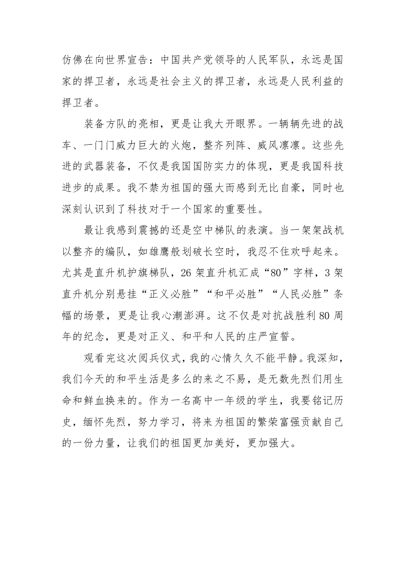 9.3抗战胜利大阅兵初高中学生征文(高中)观九三阅兵有感为了纪念中国人民抗日战争暨世界反法西斯战争胜利八十周年,今天,我国在天安门广场举行了一场声势浩大的阅兵仪式,这次阅兵的主题是“纪念抗战伟大胜利,弘扬抗战伟大精神”。总书记振奋人心的重要讲话,更是让我们深刻认识到了这场胜利的伟大意义。阅兵仪式正式开始了,我的心情也随之变得无比激动和自豪。首先映入眼帘的是整齐划一的标兵方阵,他们如同一棵棵挺拔的青松,屹立在天安门广场的两侧,为阅兵仪式拉开了庄严的序幕。习近平主席乘红旗检阅车,经过金水桥,驶上长安街。“同志们好!”“同志们辛苦了!”主席那亲切的问候声通过电视屏幕传来,振奋着每一位受阅官兵的心,也让我们感受到了国家对军人的关怀和尊重。“主席好!”“为人民服务!”受阅官兵们斗志昂扬的回答声震长空,那声音仿佛能穿透云霄,展现出了他们的坚定信念和无限忠诚。一个个徒步方队迈着整齐的步伐,昂首挺胸地走过天安门广场。他们的动作整齐划一,口号响亮有力,展现出了中国军人的卓越风采和顽强斗志。我尤其被仪仗方队所震撼,他们高擎党旗、国旗、军旗,那庄重的神情、稳健的步伐,