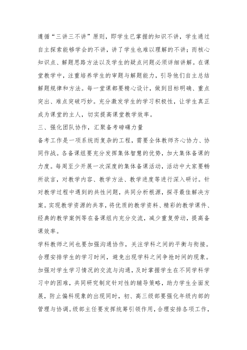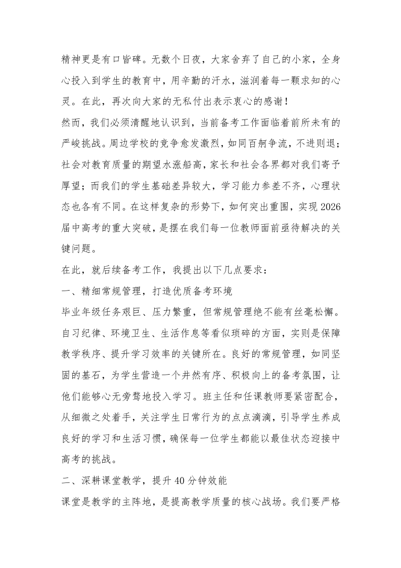 毕业年级备考推进会,校长总结讲话:精准发力,全面提升备考质量!晨晨老师2个月前发布关注私信16.96KB8页0346 以下为资料部分截图预览,下载后为超高清原文件。 第1页 / 共8页 第2页 / 共8页 第3页 / 共8页 试读已结束,还剩5页,您可下载完整版后进行离线阅读 加入VIP,享海量教务资料,无限制免费下载所有材料 毕业年级备考推进会,校长总结讲话:精准发力,全面提升备考质量!此内容为付费资源,请付费后查看¥9.99¥15.99VIP会员免费代理(享70%分佣)免费立即购买您当前未登录!建议登陆后购买,可保存购买订单付费资源© 版权声明文章版权归作者所有,未经允许请勿转载。THE END演讲致词 文本预览 各位老师:大家好!今天,我们相聚在此召开毕业年级备考工作推进会,这是一场关乎学校发展、学生未来的重要会议。其意义重大,犹如为即将踏上中高考战场的师生们吹响了集结号,目标明确且坚定一一凝聚各方力量,提升教育教学成效,为2026届中高考全力冲刺加油助力。刚刚,X主任细致入微地梳理了近三年中高考成绩,这不仅是对过往教学成果的深度复盘,更是为我们精准锚定了2026届备考目标。将备考任务精确到每个班级,真正做到了责任明确、标准清晰、人人有责。这无疑为我们接下来的备考工作绘制了详细的路线图,指明了前行方向。初、高三级部主任的表态发言也令人振奋,他们目标清晰、措施得力,充分彰显了我们毕业年级教师团队勇于担当、积极进取的精神风貌。在此,我谨代表学校,向奋战在备考一线、默默奉献的全体老师们,致以最诚挚的感谢和最崇高的敬意!毕业年级的教学质量,始终是学校发展的核心命脉,是衡量学校办学水平的重要标尺,更是社会各界高度关注的焦点。我们为2026届中高考设定目标,绝非凭空臆想,而是基于学校长远发展的实际需求,是对每一位学生成长成才的高度负责,更是源于对全体教师卓越专业素养和无私敬业精神的充分信赖。近年来,我们的教师队伍不断发展壮大,大家的专业能力稳步提升,敬业 查看更多 收起部分 喜欢就支持一下吧点赞6 分享QQ空间微博QQ好友海报分享复制链接收藏
