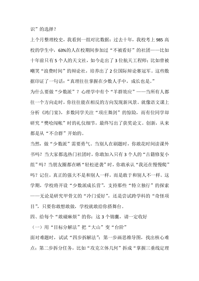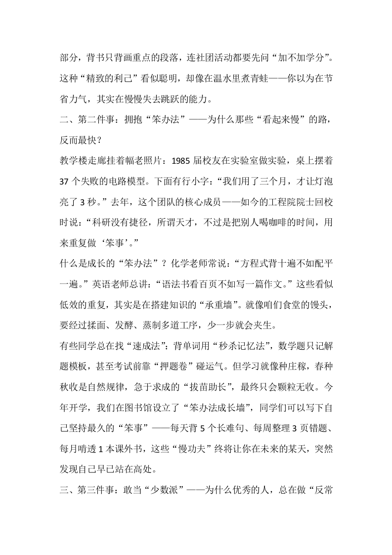新学期,校长第一次在国旗下讲话:为什么真正的成长,始于这3件“麻烦事”?晨晨老师2个月前发布关注私信14.63KB5页0418 以下为资料部分截图预览,下载后为超高清原文件。 第1页 / 共5页 第2页 / 共5页 第3页 / 共5页 试读已结束,还剩2页,您可下载完整版后进行离线阅读 加入VIP,享海量教务资料,无限制免费下载所有材料 新学期,校长第一次在国旗下讲话:为什么真正的成长,始于这3件“麻烦事”?此内容为付费资源,请付费后查看¥9.99¥15.99VIP会员免费代理(享70%分佣)免费立即购买您当前未登录!建议登陆后购买,可保存购买订单付费资源© 版权声明文章版权归作者所有,未经允许请勿转载。THE END演讲致词 文本预览 新学期,校长第一次在国旗下讲话:为什么真正的成长,始于这3件“麻烦事”?晨光洒满操场时,我总会想起校门口那棵老槐树一一它的树干上有三道深深的刻痕,那是2008年冰灾留下的印记。如今,这些伤痕处却长出了最粗壮的枝桠。同学们,成长从来不是一帆风顺的坦途,那些让我们头疼的“麻烦事”,恰恰是生命拔节的声音。今天,我想和大家聊聊:新学期,真正能让你脱胎换骨的,正是这3件看似“自讨苦吃”的事。一、第一件事:主动“啃硬骨头”一为什么学霸都爱做“不划算”的题?上周翻阅高三年纪错题本时,我发现了一个有趣的现象:年级前50名的同学,错题本上90%的题目都是附加题和拓展题。而有些同学的本子上,只记着“老师说必考”的基础题。这让我想起上届考上清华的王同学,他的数学笔记本扉页写着:“考试不考的题,才是拉开差距的题。”为什么要主动找“硬骨头”啃?生物课上我们学过“用进废退”一大脑和肌肉一样,越练越强。去年物理竞赛获奖的李同学分享过一个细节:他每天特意留1小时做“超纲题”,刚开始一道题要查5次资料、问3个老师,现在却能给学弟学妹讲题。他说:“难的题像磨刀石,磨的不是题,是解题的思维和耐心。”反观有些同学,总在做“性价比最高”的选择:作业只写老师批改的 查看更多 收起部分 喜欢就支持一下吧点赞8 分享QQ空间微博QQ好友海报分享复制链接收藏