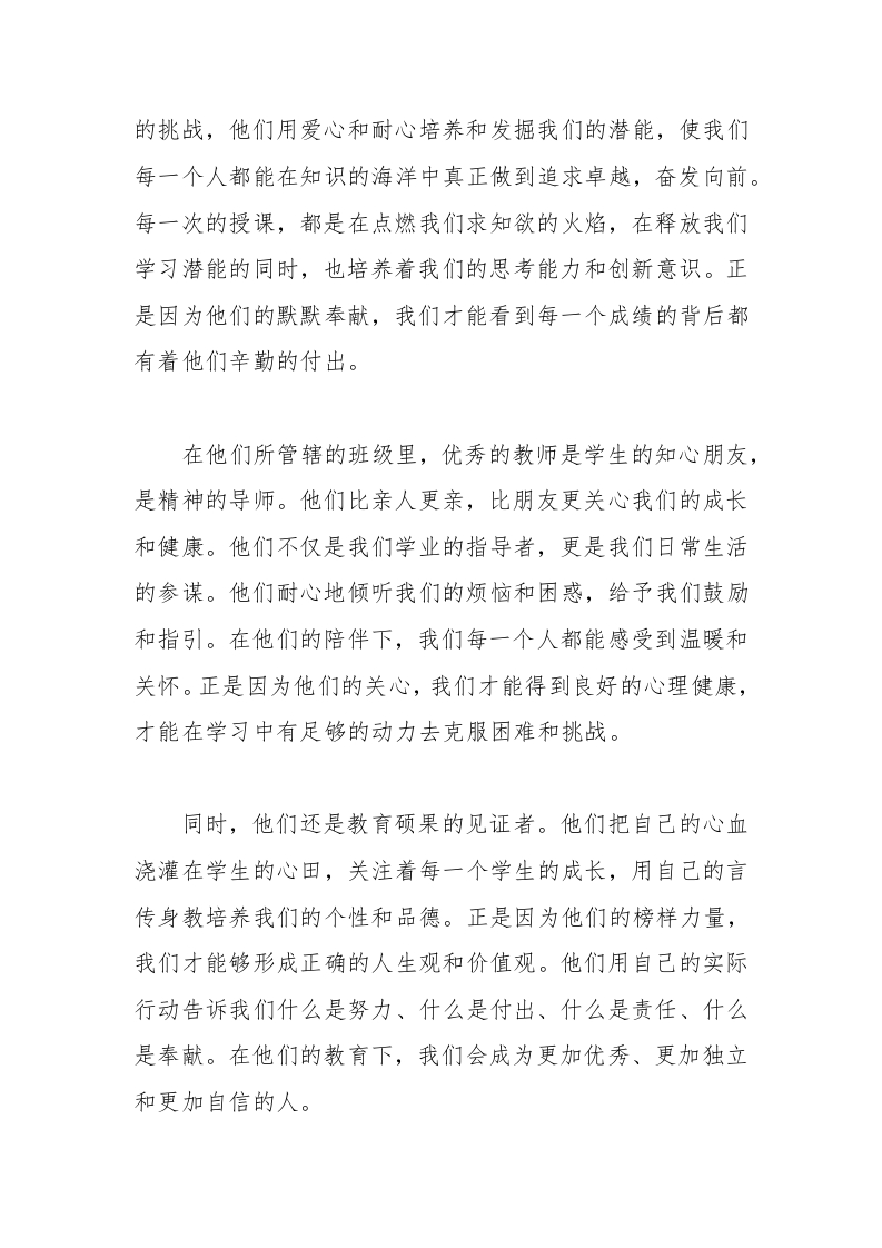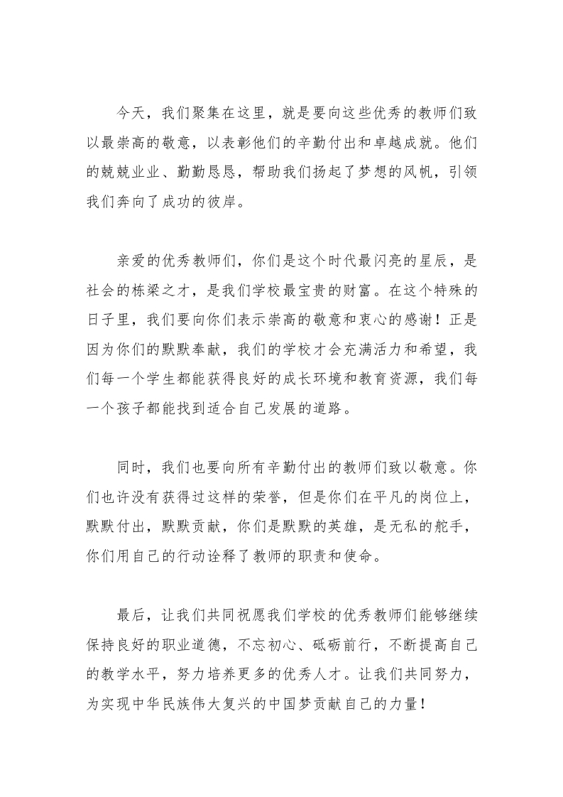 优秀教师表彰讲话稿晨晨老师2个月前发布关注私信12.99KB4页03615 以下为资料部分截图预览,下载后为超高清原文件。 第1页 / 共4页 第2页 / 共4页 第3页 / 共4页 试读已结束,还剩1页,您可下载完整版后进行离线阅读 加入VIP,享海量教务资料,无限制免费下载所有材料 优秀教师表彰讲话稿此内容为付费资源,请付费后查看¥9.99¥15.99VIP会员免费代理(享70%分佣)免费立即购买您当前未登录!建议登陆后购买,可保存购买订单付费资源© 版权声明文章版权归作者所有,未经允许请勿转载。THE END演讲致词 文本预览 优秀教师表彰讲话稿尊敬的领导、教师同仁、亲爱的同学们:大家好!首先,我代表学校全体师生向大家表示热烈的欢迎和衷心的感谢!今天,我们举行这个庄重而庆祝的仪式,就是为了表彰我们学校的优秀教师,感谢他们在教学岗位上辛勤耕耘和默默奉献的付出。教师是祖国的筑梦人,是培养人才的引路人。他们默默无闻地奉献着自己的青春和智慧,用无私的爱心培育着花朵,用辛勤的汗水播种着希望。每一个孩子的成长离不开老师的关心和教导,每一个人的成功都充满了老师的辛勤付出。正是因为他们的辛勤才会有我们今天的欢聚。在课堂上,优秀的教师呵护着我们的每一段知识的脆弱之花。他们以激情和责任心引领着我们,他们积极面对教学 查看更多 收起部分 喜欢就支持一下吧点赞15 分享QQ空间微博QQ好友海报分享复制链接收藏