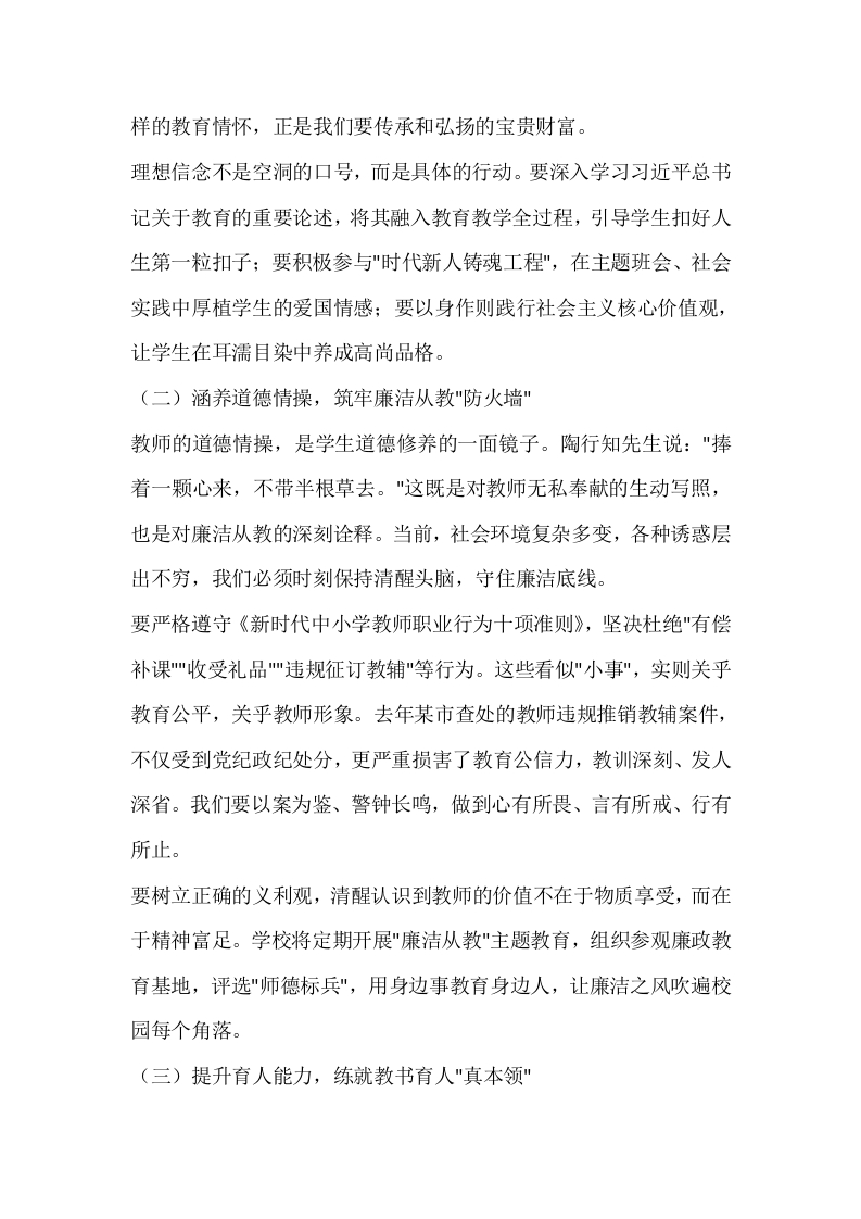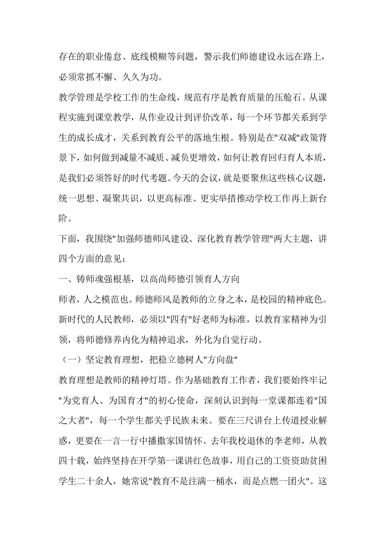 在2025年秋季学期师德师风建设暨教育教学管理工作会议上的讲话:守教育初心担育人使命,强师德师风建清廉校园晨晨老师2个月前发布关注私信18.40KB9页04115 以下为资料部分截图预览,下载后为超高清原文件。 第1页 / 共9页 第2页 / 共9页 第3页 / 共9页 试读已结束,还剩6页,您可下载完整版后进行离线阅读 加入VIP,享海量教务资料,无限制免费下载所有材料 在2025年秋季学期师德师风建设暨教育教学管理工作会议上的讲话:守教育初心担育人使命,强师德师风建清廉校园此内容为付费资源,请付费后查看¥9.99¥15.99VIP会员免费代理(享70%分佣)免费立即购买您当前未登录!建议登陆后购买,可保存购买订单付费资源© 版权声明文章版权归作者所有,未经允许请勿转载。THE END演讲致词 文本预览 在2025年秋季学期师德师风建设暨教育教学管理工作会议上的讲话:守教育初心担育人使命,强师德师风建清廉校园各位同仁,同志们:金秋送爽启新篇,桃李芬芳育英才。今天,我们怀着对教育事业的赤诚与担当,召开新学期师德师风建设暨教育教学管理工作会议。这次会议既是贯彻落实教育部《关于加强和改进新时代师德师风建设的意见》的政治任务,也是推动学校内涵发展的现实需要;既是对过往工作的总结反思,更是对未来征程的谋篇布局。站在"十四五"教育改革的关键节点,面对"双减"政策深化实施的时代要求,我们必须以"躬耕教坛、强国有我"的使命感,以"时时放心不下"的责任感,将师德师风建设作为立校之本,将规范管理作为强校之基,共同书写立德树人的时代答卷。教育是国之大计、党之大计,教师是立教之本、兴教之源。习近平总书记强调:"评价教师队伍素质的第一标准是师德师风。"这深刻揭示了师德师风对于教育事业的极端重要性。一所学校的魅力,不在于楼宇之宏伟,而在于师风之纯粹;一位教师的价值,不在于桃李之多少,而在于德行之高低。近年来,我校始终把师德师风建设摆在突出位置,涌现出一批爱岗敬业、无私奉献的优秀教师,他们用行动诠释了"学高为师,身正为范"的深刻内涵。但我们也要清醒看到,个别教师中 查看更多 收起部分 喜欢就支持一下吧点赞15 分享QQ空间微博QQ好友海报分享复制链接收藏