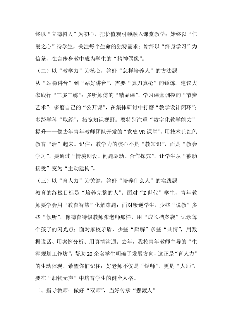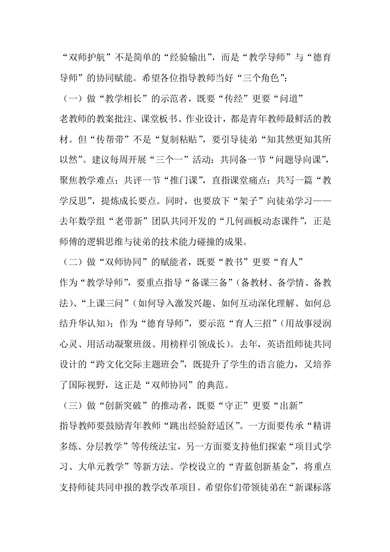 校长在“青蓝工程”师徒结对仪式上的讲话:三力聚合、双师护航晨晨老师2个月前发布关注私信13.19KB14.67KB5页0265 以下为资料部分截图预览,下载后为超高清原文件。 第1页 / 共5页 第2页 / 共5页 第3页 / 共5页 试读已结束,还剩2页,您可下载完整版后进行离线阅读 加入VIP,享海量教务资料,无限制免费下载所有材料 校长在“青蓝工程”师徒结对仪式上的讲话:三力聚合、双师护航此内容为付费资源,请付费后查看¥9.99¥15.99VIP会员免费代理(享70%分佣)免费立即购买您当前未登录!建议登陆后购买,可保存购买订单付费资源© 版权声明文章版权归作者所有,未经允许请勿转载。THE END演讲致词 文本预览 校长在“青蓝工程”师徒结对仪式上的讲话:三力聚合、双师护航尊敬的各位指导教师、亲爱的青年教师们:大家上午好!今天,我们以“青蓝结对”为名相聚于此,共同启动2025年度“双师护航计划”一一现场32位经验丰富的指导教师与28名新入职教师正式结对,将通过“教学导师+德育导师”双轨培养,破解青年教师“站稳讲台、站好讲台、站亮讲台”的三年成长难题。这份“青蓝之约”,既是老教师教育智慧的传承,更是新教师专业成长的“加速密码”。接下来,我将围绕“青年教师如何借势成长”“指导教师如何赋能传承”“学校如何搭建平台”三个维度,与大家共同解码“三年成长方程式”。一、青年教师:锤炼“三力”,答好成长“必答题”青年教师的三年成长,本质是“师德力、教学力、育人力”的三维进阶。要实现从“新手”到“骨干”的跨越,必须答好三道“必答题”:(一)以“师德力”为根基,答好“为谁培养人”的方向题教育是“一朵云推动另一朵云”的心灵唤醒。去年入职的王老师,在乡村支教期间用“每周一封家书”架起与留守儿童的沟通桥梁:语文组李老师坚持12年书写“教育札记”,记录学生成长的每个瞬间。这些故事告诉我们:师德不是抽象概念,而是深夜备课的灯光、作业本上的批注、与学生促膝长谈的耐心。希望你们做到“三个始终”:始 查看更多 收起部分 喜欢就支持一下吧点赞5 分享QQ空间微博QQ好友海报分享复制链接收藏