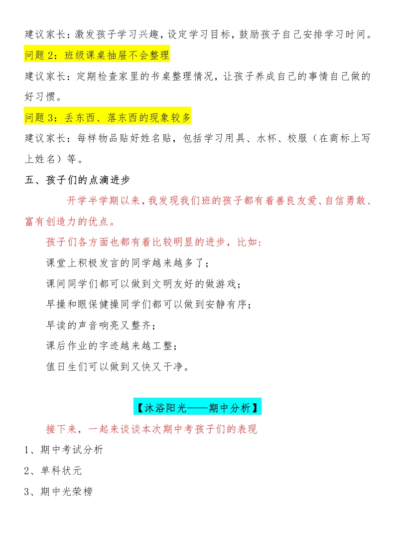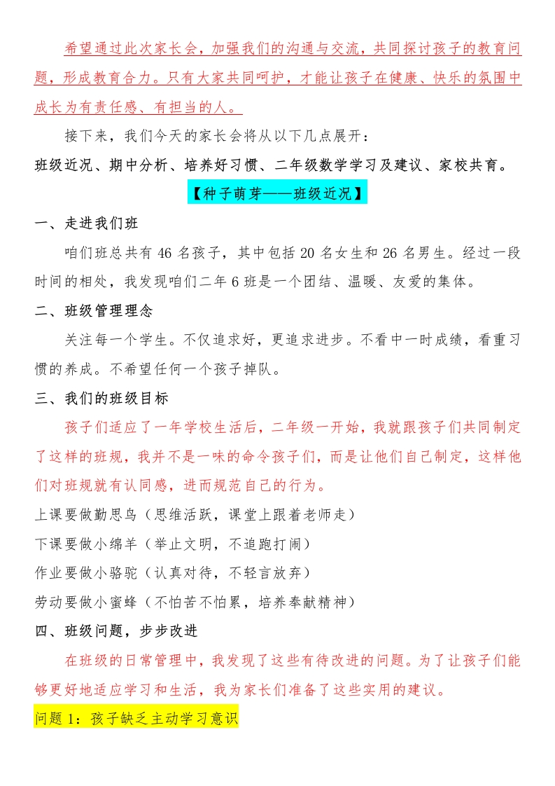二年级数学家长会发言稿(彩色完整版)晨晨老师2个月前发布关注私信0.23MB17页04812 以下为资料部分截图预览,下载后为超高清原文件。 第1页 / 共17页 第2页 / 共17页 第3页 / 共17页 试读已结束,还剩14页,您可下载完整版后进行离线阅读 加入VIP,享海量教务资料,无限制免费下载所有材料 二年级数学家长会发言稿(彩色完整版)此内容为付费资源,请付费后查看¥9.99¥15.99VIP会员免费代理(享70%分佣)免费立即购买您当前未登录!建议登陆后购买,可保存购买订单付费资源© 版权声明文章版权归作者所有,未经允许请勿转载。THE END班级管理 文本预览 二年级期中家长会逐字稿《静待花开,聆听成长的声音》各位家长好!我是二年6班的班主任兼数学老师,很高兴能和大家相聚在这里,共同关注孩子们的成长与发展。孩子们步入二年级下学期,已经过了半学期,在这段时间里,他们有了很多的进步和变化。今天的家长会,我将和大家一起回顾孩子们在学校的学习和生活情况,分享他们的成长点滴,同时也希望能和大家共同探讨如何更好地帮助孩子们成长。会议开始之前,和家长们分享一个小短片《每朵花都会盛开》。《每朵花都会盛开》带给我们的教育启示:1、每朵花都会盛开,只是在不同的季节2、每个孩子都是一粒种子,只是花期不同3、每个孩子都会长大,只是有人慢有人快每个孩子都是一颗独特的种子,拥有着无限的潜能和可能性。他们就像一朵朵含苞待放的花朵,需要我们用心呵护,用爱浇灌,静待花开。静待花开,是我们耐心教育的过程。孩子的成长是一个漫长的过程,不可能一蹴而就。我们要学会尊重孩子的成长规律,不要拔苗助长,更不要急功近利。我们要相信,每个孩子都有自己的花期,只要我们给予足够的耐心和等待,他们终将绽放出属于自己的光彩。用心聆听孩子成长的声音。孩子的成长不仅体现在学习成绩上,更体现在他们一点一滴的进步中。我们要用心观察,用心感受,去发现孩子的闪光点,去欣赏他们的每一次进步,去聆听他们内心真实的声音。当然,静待花开并不意味着放任自流。作为家长,我们也要积极行动起来,为孩子的成长创造良好的环境。 查看更多 收起部分 喜欢就支持一下吧点赞12 分享QQ空间微博QQ好友海报分享复制链接收藏