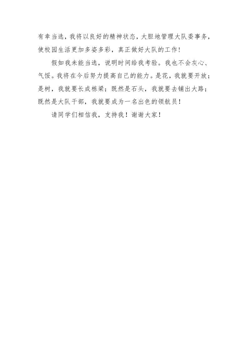 学校大队委竞选演讲稿尊敬的老师,亲爱的同学们:大家好!我是来自六年级1班的李卓。今天能站在这个讲台上参加竞选大队委,我感到十分荣幸,也很激动。我很清楚,我的竞争对手都是各班优秀学生代表,但我充分相信自己的能力,我决定参加竞选。也想借这次的竞选活动,考验自己的能力,增强自己的信心,也能锻炼我的胆量。并想在我小学的最后一个阶段为学校做点事,有意义地度过这珍贵的最后一年。我五年来都是班长,这从小锻炼了我的组织能力和语言表达能力,无论在学习成绩、思想品德、组织管理能力等方面都能起到模范带头作用,并且有了进步性的提升。我德、智、体、美、劳全面发展,不仅各门功课学得好,课余时间对书法、画画等都非常感兴趣。书法和写作也多次获得校级奖项,被评为校级“三好学生”和“优秀学生干部”。我心目中的大队委是学习优秀,热爱集体,关爱同学,乐于助人,尊敬老长的好学生;是勇敢、阳光、积极向上、多才多艺的好少年;是同学的榜样,是老师的助手。我也希望自己是这么一名同受学们喜欢和信服的大队委。加入大队委,是一种荣誉,更是一种责任。我知道这条路上有许多挑战,但我自信我有能力担起这副担子,如果我