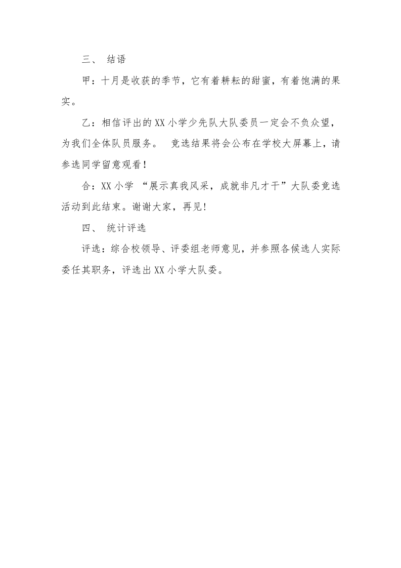 少先队大队委竞选活动主持词甲:蓝天上飘下一朵红云,化作我们鲜红的领巾。乙:大地上绽出一片金色,化作我们灿烂的星星火炬。合:大家下午好!甲:为深入学习贯彻党的二十大精神,进一步推进学校少先队工作的发展,提高我校少先队组织的整体素质,使少先队组织更具有活力。今天我们将在这里隆重举行Xx学校第X届少先队大队委员会换届选举活动。乙:秋天是收获的季节。在这秋高气爽的九月,我们欢聚一堂,举行本次大队活动。乙:“红领巾心向党,小岗位大梦想”大队委竞选活动---合:现在开始!一、领导讲话,大家欢迎!甲:首先,欢迎今天参加竞选的领导和评委老师们,同时还有四至六年级各班经过择优推荐参加竞选的同学们。我们将在所有选手演讲展示后,由各位领导和评委老师打分评选出新一届的大队委。乙:经过选手们的精心准备,每位选手今天将有3分钟左右的演讲时间展现自己,相信他们已经准备好了,对吗?二、竞选演讲甲:首先上台的是1号候选人()班XXX乙:接下来上台的是2号候选人()班XXX
