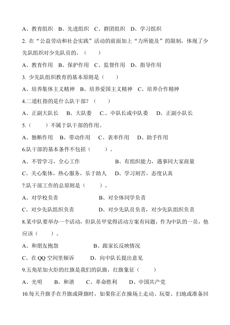 2025学年少先队大队委竞选笔试姓名:中队:分数:亲爱的少先队员们:非常欢迎你们加入双小学少先大队干部竞选上岗的行列中,希望你们能在笔试这一环节中取得好的成绩!一、填空题(40分)1.我们的队名是简称2.我们队的创立者和领导者是3.我们的队旗是我们的队徽由和写有“中国少先队”的红色绶带组成。4.我们的队礼是右手五指并拢,高举头上,它表示5.我们的作风是6.少先队建队日是(1949)年月日,今年是中国少年先锋队组织建队周年。7.少先队的呼号是回答:8.社会主义核心价值观的基本内容,富强、民主、是国家层面的价值目标,自由、平等、法治、法治是的价值取向,爱国、敬业、是公民个人层面的价值准则。二、选择题(30分)1.少先队是中国少年儿童的(),是少年儿童学习中国特色社会主义和共产主义的学校,是建设社会主义和共产主义的预备队。