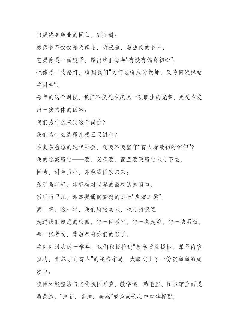 第41个教师节校长讲话:躬耕教坛育桃李,赓续初心启新篇晨晨老师2个月前发布关注私信16.01KB6页0307 以下为资料部分截图预览,下载后为超高清原文件。 第1页 / 共6页 第2页 / 共6页 试读已结束,还剩4页,您可下载完整版后进行离线阅读 加入VIP,享海量教务资料,无限制免费下载所有材料 第41个教师节校长讲话:躬耕教坛育桃李,赓续初心启新篇此内容为付费资源,请付费后查看¥9.99¥15.99VIP会员免费代理(享70%分佣)免费立即购买您当前未登录!建议登陆后购买,可保存购买订单付费资源© 版权声明文章版权归作者所有,未经允许请勿转载。THE END校长讲话 文本预览 尊敬的各位老师、亲爱的同事们、同行者们:大家上午好!丹桂飘香,秋阳映窗。在这硕果盈枝的良辰,在这温润丰收的九月时节,我们隆重集会,庆祝属于全体教育工作者的第41个教师节!四十一年前,“教师节”被正式设立,自那以后,每一年的9月10日,变成了我们最庄严的一天,一次次感动共鸣的“师者归属之日”。正如诗人所言:九月很普通,但因有了“教师的名字”,她不再只是日历上的秋风一次撒落。九月很平常,但因你们在晨光中走进教室、日暮后仍在板书中钻研,她成为国家记忆中一座永远明亮的教育坐标。此刻,我谨代表学校党支部、校委会,向全体教职员工致以节日最真挚的问候与最崇高的敬意!也请允许我,把这份敬意延伸到那些在为人师表道路上默默奉献一生的教师前辈,向所有在背后默默支持教师工作的亲属家人,道一声:“感谢你们的理解与付出!”第一章:教师节,不只是节日,而是一次集体信仰的归心时刻很多人问我们:“教师节到底意味着什么?”有人说,这是学生对老师的一次感恩,也有人说,这是社会对教育群体的一次礼遇。但在我心中,每一个真正热爱讲台、把教师 查看更多 收起部分 喜欢就支持一下吧点赞7 分享QQ空间微博QQ好友海报分享复制链接收藏