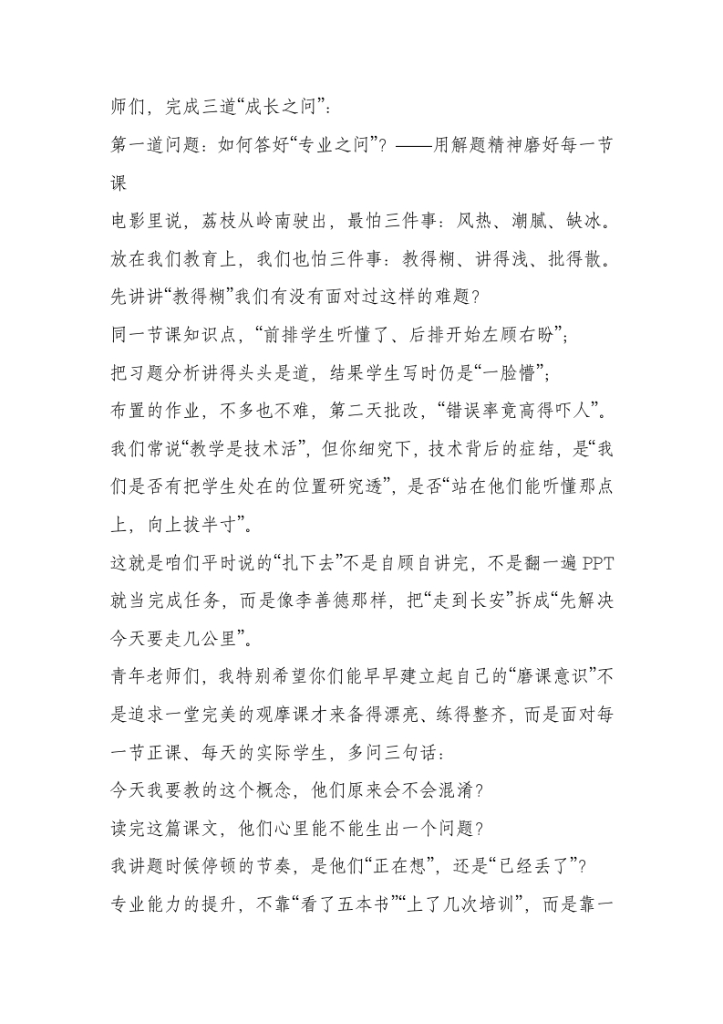 青年教师座谈会校长致辞:《长安的荔枝》启示:送一份执着,育一树未来晨晨老师2个月前发布关注私信16.57KB6页0479 以下为资料部分截图预览,下载后为超高清原文件。 第1页 / 共6页 第2页 / 共6页 试读已结束,还剩4页,您可下载完整版后进行离线阅读 加入VIP,享海量教务资料,无限制免费下载所有材料 青年教师座谈会校长致辞:《长安的荔枝》启示:送一份执着,育一树未来此内容为付费资源,请付费后查看¥9.99¥15.99VIP会员免费代理(享70%分佣)免费立即购买您当前未登录!建议登陆后购买,可保存购买订单付费资源© 版权声明文章版权归作者所有,未经允许请勿转载。THE END校长讲话 文本预览 亲爱的青年教师们:大家上午好!很高兴今天有机会与咱们学校的“青年力量”围坐在一起,聊聊成长,说说故事,也谈谈咱们为什么出发,又要走向哪里。今天我不讲规章制度,也不布置任务安排,这是一场写给心里的分享会。前不久,暑期档热播的电影《长安的荔枝》收获了不少观众的泪水和欢笑。电影讲了一个温暖但实在也“荒唐”的命题:要在盛夏,将南方岭南的鲜荔枝,三天之内送到五千里外的长安。别人看到的是“任务天方夜谭“操作毫无胜算”,但主人公李善德,不急着抱怨、不畏难喊退,而是一刀一刀地解题用果农的智慧保鲜果肉,用百姓的力量分段接力,用盐水、薄冰、步数、行脚,一寸寸走出不可能之路。为什么这部电影能带来共鸣?因为它看似在讲一件稀奇古怪的事,其实讲的正是许多普通人“把一件不确定的难事,做好”的努力过程。于是我在想:这不就是咱们当老师的真实故事吗?每个孩子的成长,又何尝不是一颗南方的娇嫩荔枝?天热路远,不耐颠簸,既怕忽视,也需精准照护。我们不正是那作为“递果人”的角色,日复一日,苦中带甜,守一条教育路,护一车孩子的远方。今天我不讲政策文件、不摆管理流程,想以“荔枝到长安”的这段不凡旅程为引,和咱们最年轻、最蓬勃,也最需要坚守的青年老 查看更多 收起部分 喜欢就支持一下吧点赞9 分享QQ空间微博QQ好友海报分享复制链接收藏