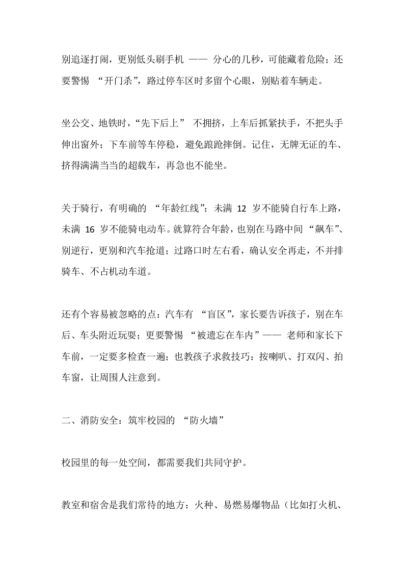 新学期开学“安全第一课”,副校长讲话:把安全刻进成长的每一步晨晨老师2个月前更新关注私信14.29KB14.27KB17.54KB9页04812 以下为资料部分截图预览,下载后为超高清原文件。 第1页 / 共9页 第2页 / 共9页 试读已结束,还剩7页,您可下载完整版后进行离线阅读 加入VIP,享海量教务资料,无限制免费下载所有材料 © 版权声明文章版权归作者所有,未经允许请勿转载。THE END安全活动校长讲话 文本预览 新学期开学“安全第一课”,副校长讲话:把安全刻进成长的每一步尊敬的老师们、亲爱的同学们:大家好!秋风拂过校园,熟悉的铃声再次响起,一张张笑脸重逢在这充满生机的角落一一新学期真的来了!今天,我想和大家聊一堂“特殊的课”,它没有课本上的公式,却关乎我们每个人的平安:它没有课后作业,却需要我们用一生去践行。这堂课的主题,就是我们成长路上最坚实的“铠甲”一安全。安全是什么?是课堂上安心听讲的专注,是课间奔跑时不用担心磕碰的自在,是放学路上顺利回家的踏实。它不是一句口号,而是融入日常的“必修课”。今天,我们就一起把这份“安全清单”理清楚、记牢固,让它成为我们新学期的“护身符”。一、交通安全:守住路上的“生命线”马路不是游乐场,每一步都要绷紧“安全弦”。过马路时,务必盯着红绿灯,“红灯停、绿灯行”不是儿歌,是规则: 查看更多 收起部分 喜欢就支持一下吧点赞12 分享QQ空间微博QQ好友海报分享复制链接收藏