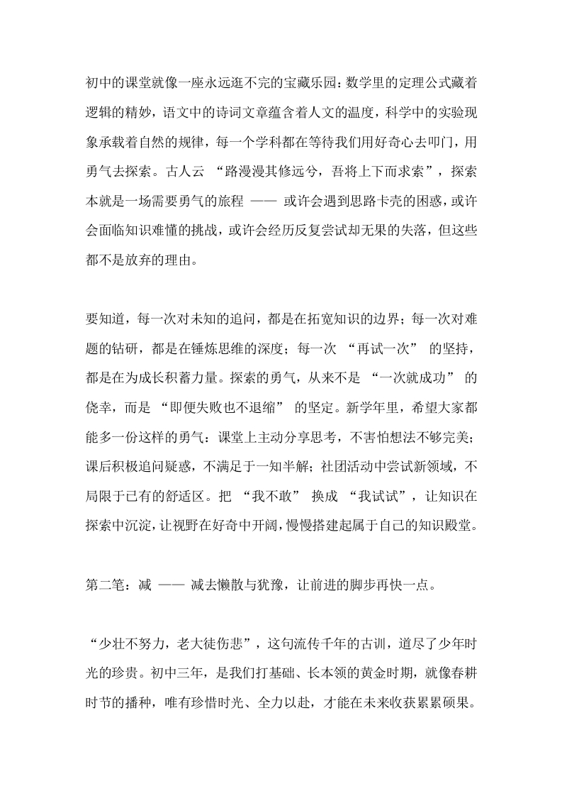 2025秋季开学典礼,初中校长讲话:携“加减乘除”成长秘诀,赴2025新学年之约晨晨老师2个月前发布关注私信16.24KB15.44KB6页0457 以下为资料部分截图预览,下载后为超高清原文件。 第1页 / 共6页 第2页 / 共6页 试读已结束,还剩4页,您可下载完整版后进行离线阅读 加入VIP,享海量教务资料,无限制免费下载所有材料 2025秋季开学典礼,初中校长讲话:携“加减乘除”成长秘诀,赴2025新学年之约此内容为付费资源,请付费后查看¥9.99¥15.99VIP会员免费代理(享70%分佣)免费立即购买您当前未登录!建议登陆后购买,可保存购买订单付费资源© 版权声明文章版权归作者所有,未经允许请勿转载。THE END校长讲话 文本预览 2025秋季开学典礼,初中校长讲话:携“加减乘除”成长秘诀,赴2025新学年之约尊敬的各位老师、亲爱的同学们:大家上午好!当秋日的第一缕晨光洒进校园,透过教学楼明亮的玻璃窗,落在崭新的课桌上,映出同学们眼中闪烁的期待:当微风拂过操场旁的香樟树,叶片沙沙作响,带来阵阵清爽的气息,也捎来了新学年的第一份问候。今天,我们齐聚在这熟悉的绿茵操场,不仅有陪伴校园多年的老师和老同学,更有带着好奇与热情加入我们大家庭的新老师、新同学一在此,我代表学校,向全体师生致以最诚挚的欢迎,也向为新学期筹备默默付出的老师们道一声:辛苦了!此刻,站在这崭新的起点,我想和大家聊聊一个特别的话题一一如何在新学年,为自己的成长写下精彩的“四笔”。这四笔,藏在我们日常的学习与生活里,藏在每一次选择和努力中,更藏在我们对未来的期许里。第一笔:加一一加一份探索的勇气,让知识的边界再远一点。 查看更多 收起部分 喜欢就支持一下吧点赞7 分享QQ空间微博QQ好友海报分享复制链接收藏