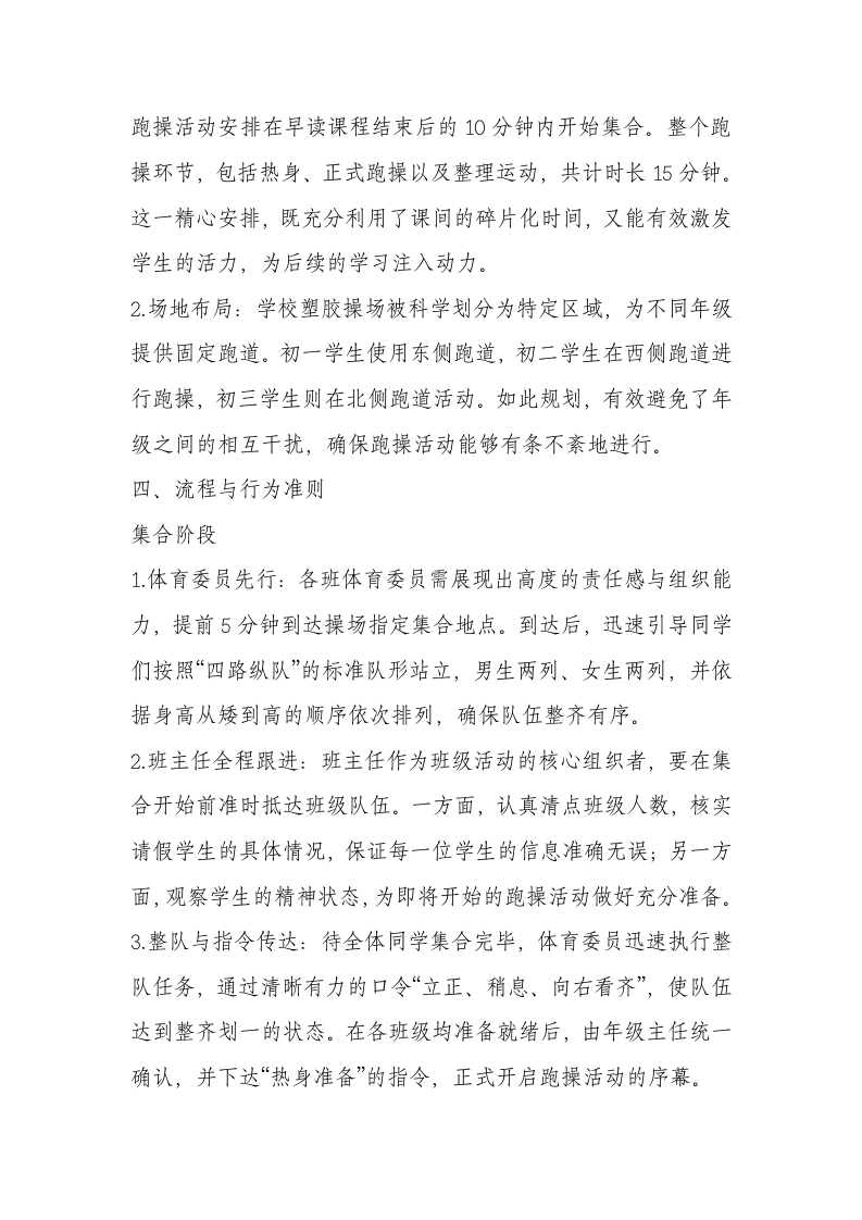 学校跑操管理制度(2025修订版)晨晨老师2个月前发布关注私信17.67KB8页03514 以下为资料部分截图预览,下载后为超高清原文件。 第1页 / 共8页 第2页 / 共8页 试读已结束,还剩6页,您可下载完整版后进行离线阅读 加入VIP,享海量教务资料,无限制免费下载所有材料 学校跑操管理制度(2025修订版)此内容为付费资源,请付费后查看¥9.99¥15.99VIP会员免费代理(享70%分佣)免费立即购买您当前未登录!建议登陆后购买,可保存购买订单付费资源© 版权声明文章版权归作者所有,未经允许请勿转载。THE END管理方案 文本预览 学校跑操管理规范(2025全新版)在追求素质教育与学生全面发展的教育征程中,跑操作为一项兼具强身健体与育人功能的重要活动,对于初中学生的成长与校园文化建设有着不可忽视的价值。为切实保障跑操活动在我校初中部一至三年级有序、高效、安全地开展,特制定本全面、细致且具有创新性的管理规范。一、目标导向1.健康体魄塑造:通过规律性的跑操活动,强化学生身体素质,助力学生养成日常锻炼的良好习惯,严格落实每日体育锻炼的基本要求,为学生的健康成长筑牢根基。2.团队精神培育:跑操过程强调集体行动,旨在培养学生的集体意识,让学生深刻体会到团队协作的力量,进而增强班级凝聚力,营造积极向上、团结奋进的校园文化氛围。3纪律素养提升:严谨规范的跑操流程,要求学生严格遵守各项规则,以此强化学生的纪律观念,培养学生的自律能力与责任感,促进学生良好行为习惯的养成。二、参与对象界定本规范适用于全体初中一至三年级学生。但对于因身体原因不适宜参与跑操的学生,需提供医院开具的有效证明,并提交书面请假申请,经学校相关部门核实批准后,可暂免跑操。三、时间与场地规划1.时间安排:在每周一至周五的学校日程中(法定节假日除外), 查看更多 收起部分 喜欢就支持一下吧点赞14 分享QQ空间微博QQ好友海报分享复制链接收藏