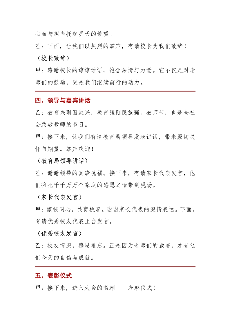 2025年第41个教师节庆祝大会主持词晨晨老师2个月前发布关注私信15.09KB5页0215 以下为资料部分截图预览,下载后为超高清原文件。 第1页 / 共5页 第2页 / 共5页 试读已结束,还剩3页,您可下载完整版后进行离线阅读 加入VIP,享海量教务资料,无限制免费下载所有材料 2025年第41个教师节庆祝大会主持词此内容为付费资源,请付费后查看¥9.99¥15.99VIP会员免费代理(享70%分佣)免费立即购买您当前未登录!建议登陆后购买,可保存购买订单付费资源© 版权声明文章版权归作者所有,未经允许请勿转载。THE END重要节日 文本预览 2025年第41个教师节庆祝大会主持词主持人:一、开场(悠扬音乐响起,大屏幕播放教师节特别短片,主持人走上舞台)甲:尊敬的各位领导、亲爱的老师们、同学们一一乙:在这金风送爽、丹桂飘香的美好时节,我们齐聚一堂,共同庆祝第41个教师节。大家一一上午好!甲:教师,是人类灵魂的工程师;教师,是点亮心灵的明灯。今天,我们满怀感恩与敬意,向所有辛勤耕耘在三尺讲台上的教师致以最崇高的礼赞!乙:今天的大会主题是:“星光引路·爱育芳华”一一致敬园丁,礼赞教育!甲:让我们在感恩与祝福的旋律中,拉开庆祝大会的帷幕。二、奏唱国歌乙:有一种旋律,激荡人心;有一种歌声,振奋力量。甲:请全体起立,奏唱国歌!少先队员行队礼。(全场肃立,奏唱国歌)乙:请坐下。三、校长致辞甲:春风化雨,润物无声。教育的道路上,总有一群人,用 查看更多 收起部分 喜欢就支持一下吧点赞5 分享QQ空间微博QQ好友海报分享复制链接收藏