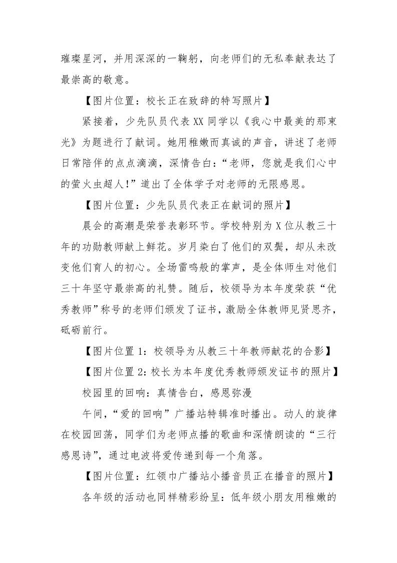 2025年秋季教师节活动宣传稿:萤火成星河,师恩深似海晨晨老师2个月前发布关注私信0.15MB3页05013 以下为资料部分截图预览,下载后为超高清原文件。 第1页 / 共3页 第2页 / 共3页 试读已结束,还剩1页,您可下载完整版后进行离线阅读 加入VIP,享海量教务资料,无限制免费下载所有材料 2025年秋季教师节活动宣传稿:萤火成星河,师恩深似海此内容为付费资源,请付费后查看¥9.99¥15.99VIP会员免费代理(享70%分佣)免费立即购买您当前未登录!建议登陆后购买,可保存购买订单付费资源© 版权声明文章版权归作者所有,未经允许请勿转载。THE END重要节日 文本预览 萤火成星河,师恩深以海我校成功举办2025年“萤火之光,感恩有你”教师节主题庆祝活动秋韵荡漾,桂子飘香。为庆祝第41个教师节,弘扬尊师重教风尚,2025年9月10日,XX小学隆重举行了以“萤火之光,感恩有你”为主题的系列庆祝活动。整个校园沉浸在温馨与感动的海洋中,同学们用最真挚的方式,向辛勤耕耘的老师们表达了最深切的敬意与祝福。晨光中的礼赞:仪式伊始,爱意满盈清晨的第一缕阳光洒向校园,教师节的活动便在温暖中拉开帷幕。学校门口,少先队礼仪队的同学们手持创意十足的手举牌,用一声声“老师,您好!”“教师节快乐!”迎接着每一位老师的到来。一份份由学生亲手制作的小礼物,承载着满满的爱,送到了老师们的手中,灿烂的笑容在每一位老师的脸上绽放。【图片位置:老师们微笑着步入校园,学生们列队欢迎、敬队礼的照片】星空下的致敬:主题晨会,温情汇聚随后,庄严而温馨的“星空下的引路人”主题晨会在操场举行。在嘹亮的国歌声后,【校长姓名】校长发表了温情致辞。他赞誉全体教师如萤火之光,汇聚成照亮学生前程的 查看更多 收起部分 喜欢就支持一下吧点赞13 分享QQ空间微博QQ好友海报分享复制链接收藏