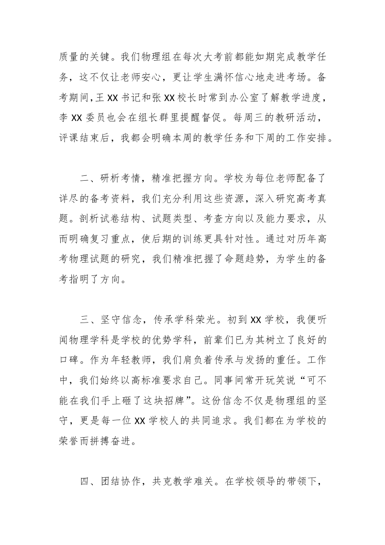 2025年学校教师节表彰大会发言晨晨老师2个月前发布关注私信12.93KB3页02911 以下为资料部分截图预览,下载后为超高清原文件。 第1页 / 共3页 第2页 / 共3页 试读已结束,还剩1页,您可下载完整版后进行离线阅读 加入VIP,享海量教务资料,无限制免费下载所有材料 2025年学校教师节表彰大会发言此内容为付费资源,请付费后查看¥9.99¥15.99VIP会员免费代理(享70%分佣)免费立即购买您当前未登录!建议登陆后购买,可保存购买订单付费资源© 版权声明文章版权归作者所有,未经允许请勿转载。THE END重要节日 文本预览 2025年学校教师节表彰大会发言尊敬的领导,亲爱的老师们:大家上午好!在这个充满敬意与感恩的日子里,我深感荣幸能够站在这里,与诸位分享上一届高三物理学科的备考心得。衷心感谢领导的信任与同仁的支持。我从高一开始便陪伴这届学生直至高三毕业。高一高二时,他们的物理成绩并不十分出众。但我们始终秉持校领导提出的“三年一体化”理念,狠抓基础教学,强化知识落实,最终在高三收获了令人欣慰的成果。在高三的四次模拟大考中,应届生物理成绩稳居全县第二、农村高中第一。回顾高三这一年的教学工作,我有以下几点感悟与大家分享。一、规划引领,稳步推进教学。每学期伊始,各教研组都会精心制定教学进度计划。而严格执行计划,是确保教学 查看更多 收起部分 喜欢就支持一下吧点赞11 分享QQ空间微博QQ好友海报分享复制链接收藏