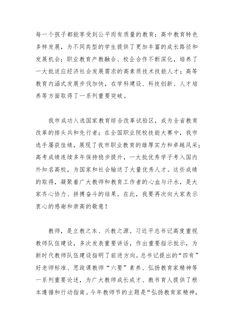 在庆祝第41个教师节活动上的致辞1晨晨老师2个月前发布关注私信17KB9页0518 以下为资料部分截图预览,下载后为超高清原文件。 第1页 / 共9页 第2页 / 共9页 试读已结束,还剩7页,您可下载完整版后进行离线阅读 加入VIP,享海量教务资料,无限制免费下载所有材料 在庆祝第41个教师节活动上的致辞1此内容为付费资源,请付费后查看¥9.99¥15.99VIP会员免费代理(享70%分佣)免费立即购买您当前未登录!建议登陆后购买,可保存购买订单付费资源© 版权声明文章版权归作者所有,未经允许请勿转载。THE END重要节日 文本预览 在庆祝第41个教师节活动上的致辞1尊敬的老师们、亲爱的同学们、同志们:金风送爽,丹桂飘香。在这个满载收获与希望的美好时节,我们怀着无比崇敬与感激之情,欢聚一堂,共同庆祝全国第41个教师节。在此,我谨代表市委、市政府,向辛勤耕耘在教育战线的全体教师和教育工作者,致以最诚挚的节日问候和最崇高的敬意!向长期关心支持教育事业发展的各界人士,表示衷心的感谢!教育,乃国之大计、党之大计。它是民族振兴、社会进步的重要基石,是功在当代、利在千秋的德政工程。近年来,我市教育系统在市委、市政府的坚强领导下,在全体教育工作者的共同努力下,紧紧围绕“办好人民满意的教育”这一目标,砥砺奋进,开拓创新,推动教育事业取得了全方位、开创性的成就。学前教育普及普惠水平显著提升,越来越多的孩子能够在安全、温馨、富有童趣的环境中开启人生的美好篇章;义务教育优质均衡发展扎实推进,城乡教育差距进一步缩小, 查看更多 收起部分 喜欢就支持一下吧点赞8 分享QQ空间微博QQ好友海报分享复制链接收藏